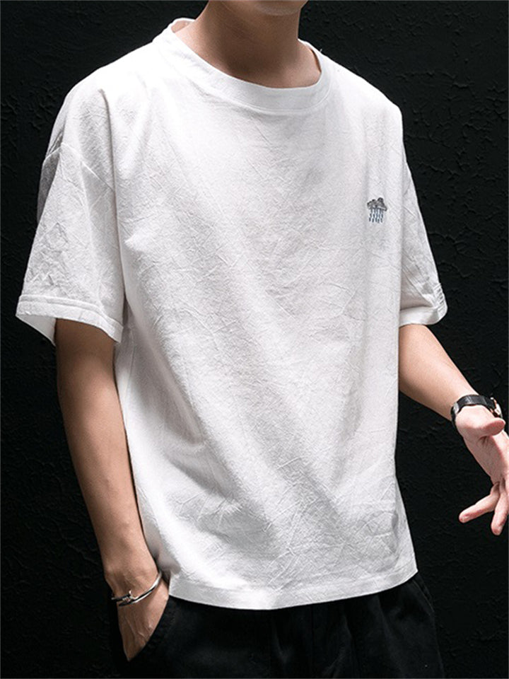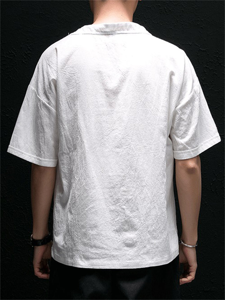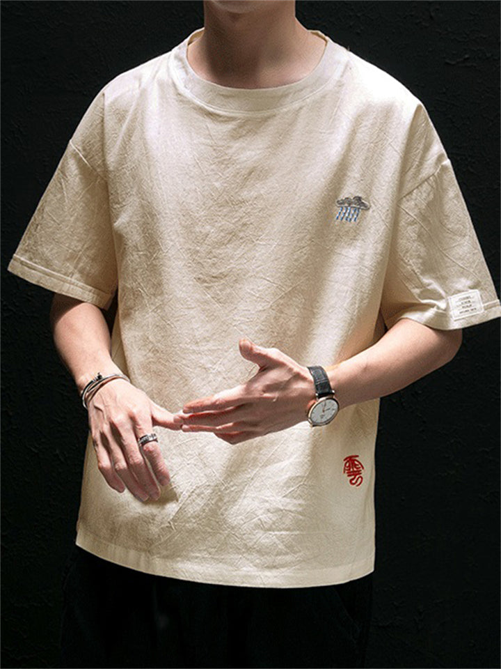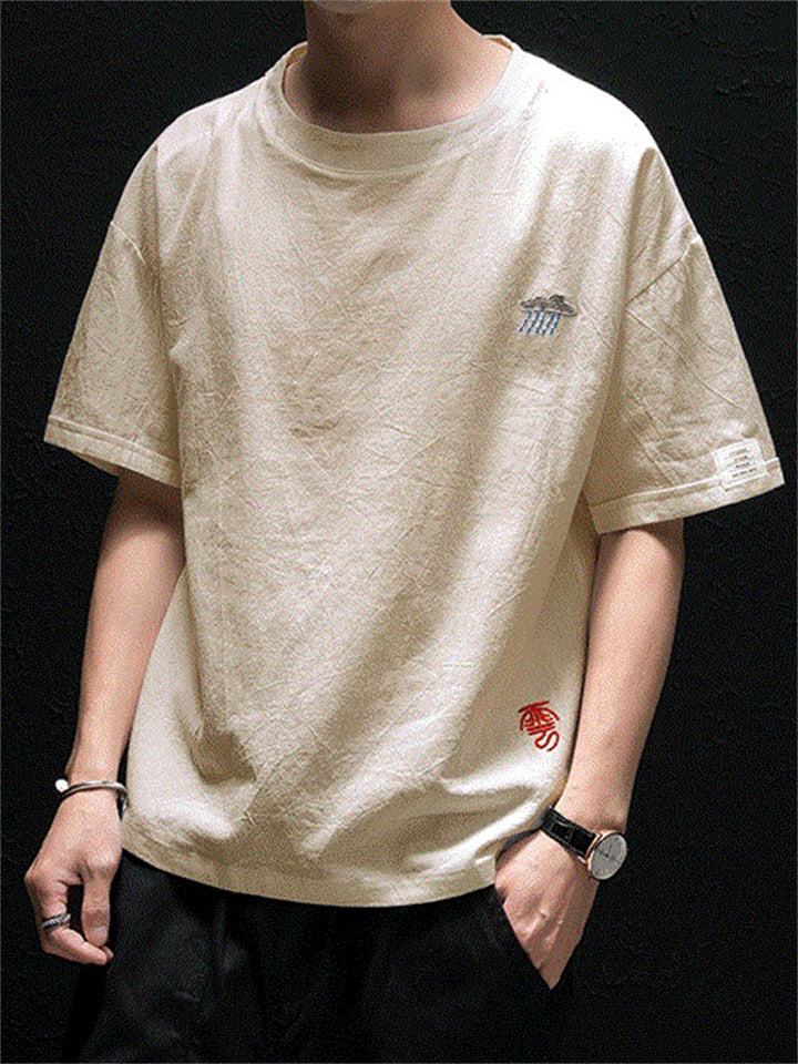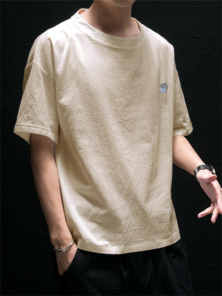 Embroidered Simple Thin Round Neck Linen Shirts For Men