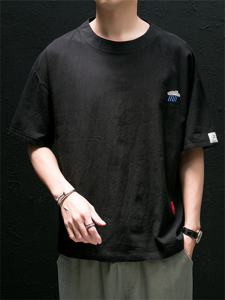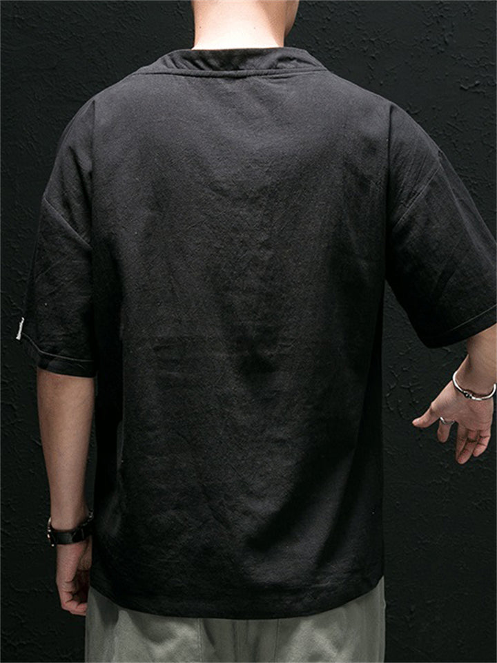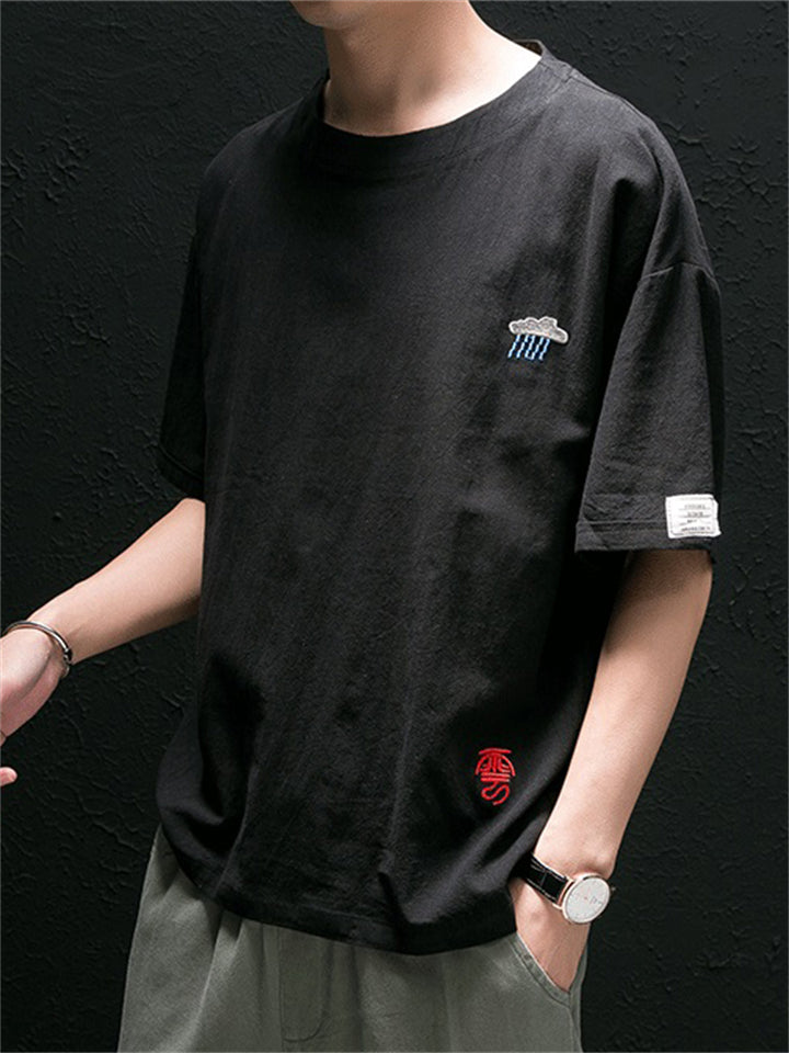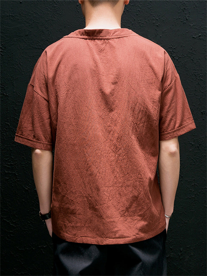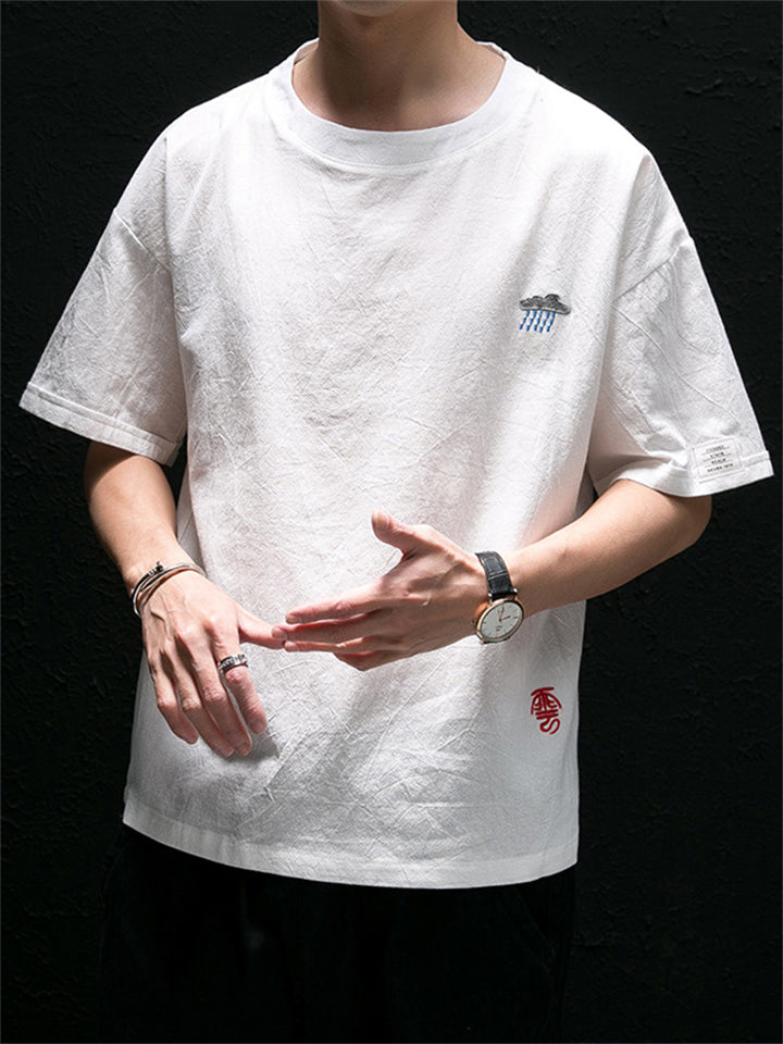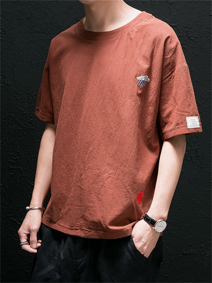 Embroidered Simple Thin Round Neck Linen Shirts For Men