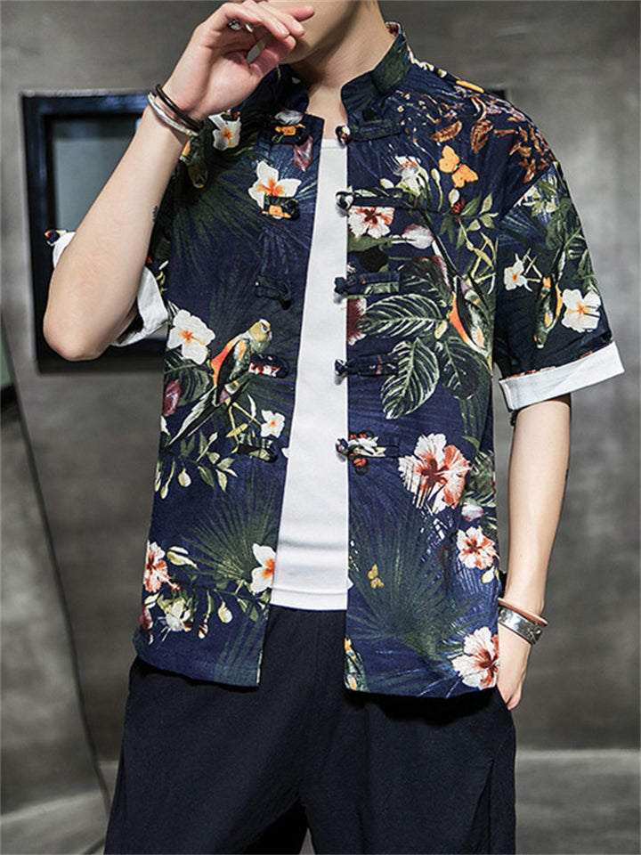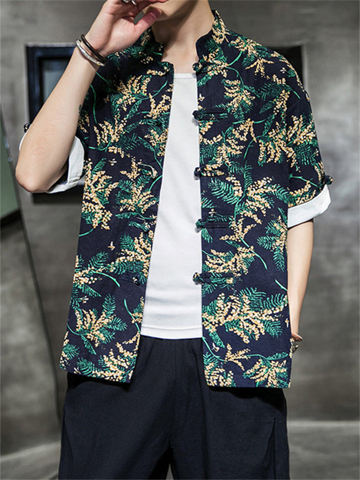 Men's Summer Bamboo Leaves Printed Stand Collar Short Sleeve TangSuit Shirts