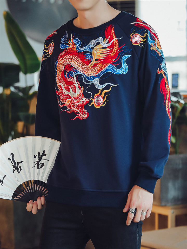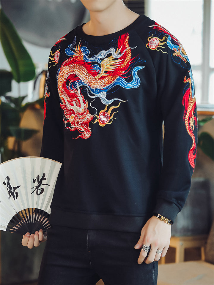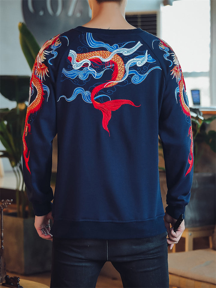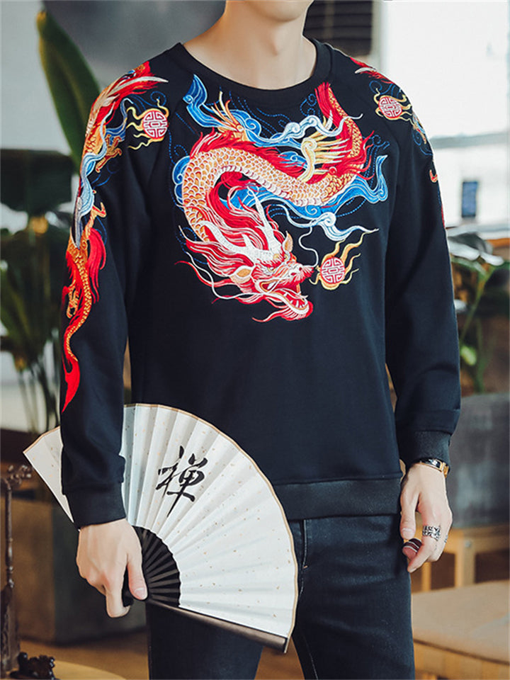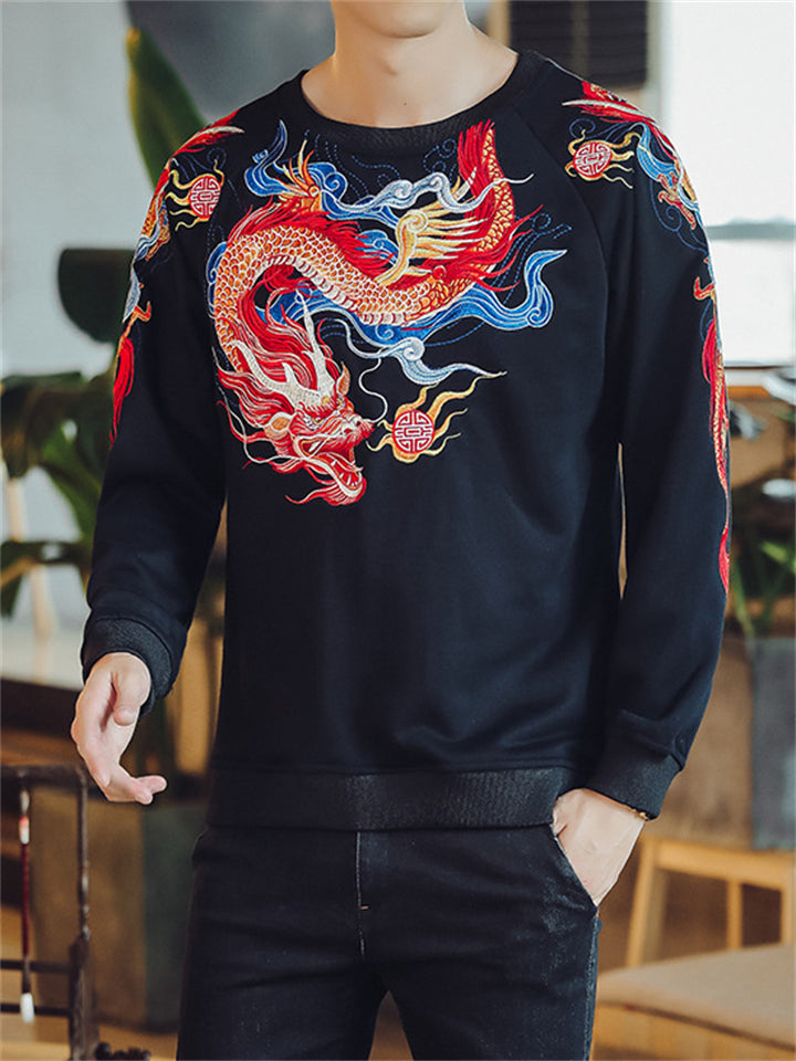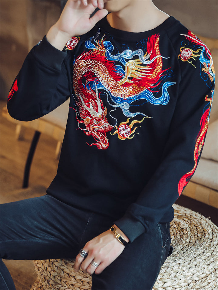 Flying Loong Embroidery Long Sleeve Round Neck Shirt