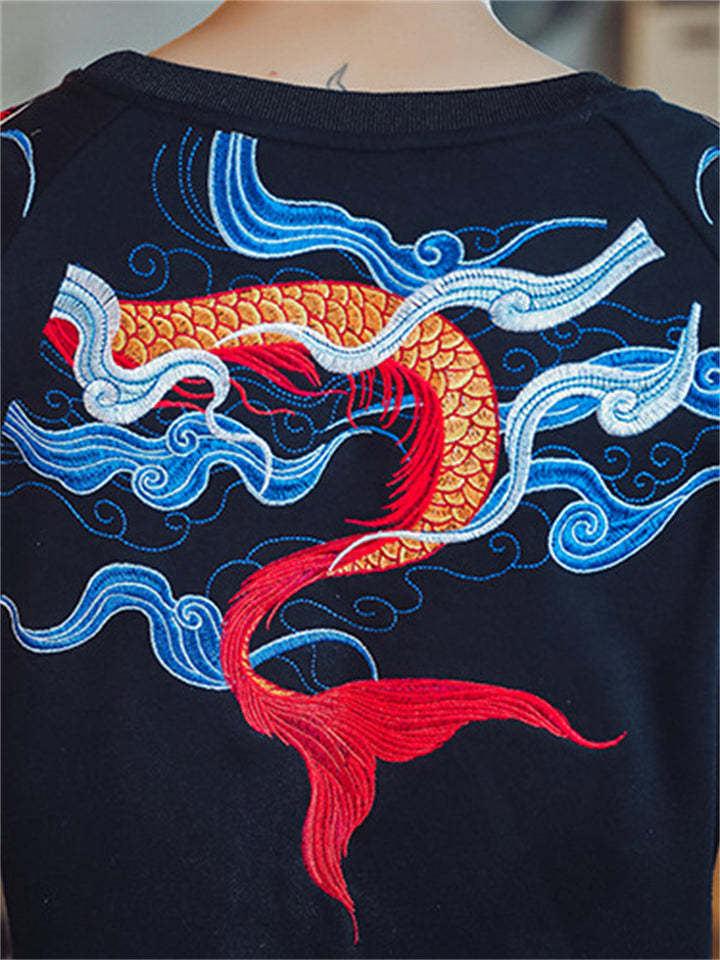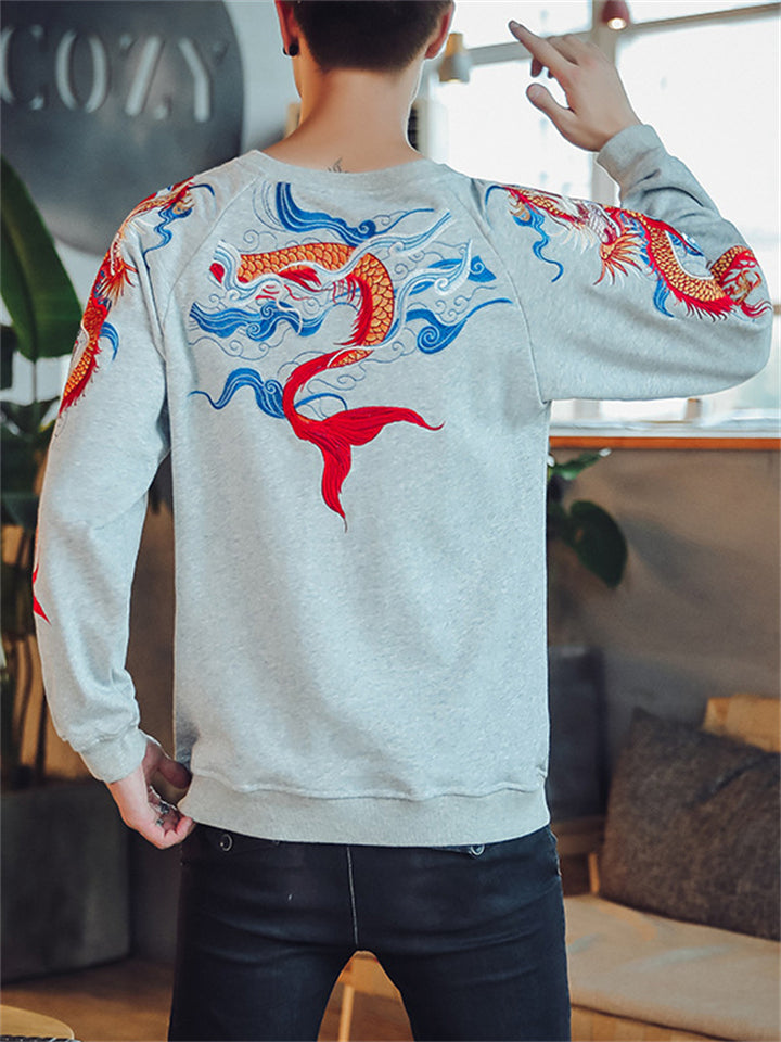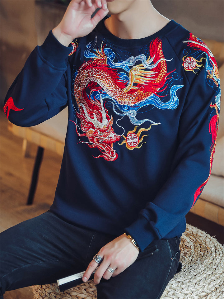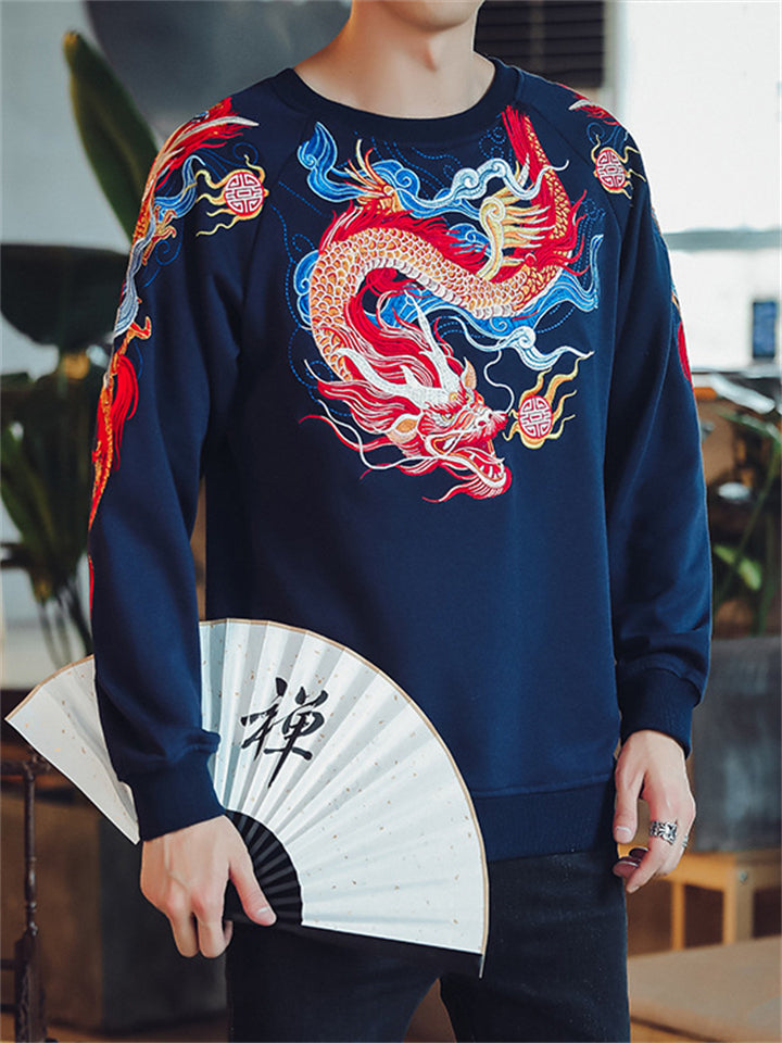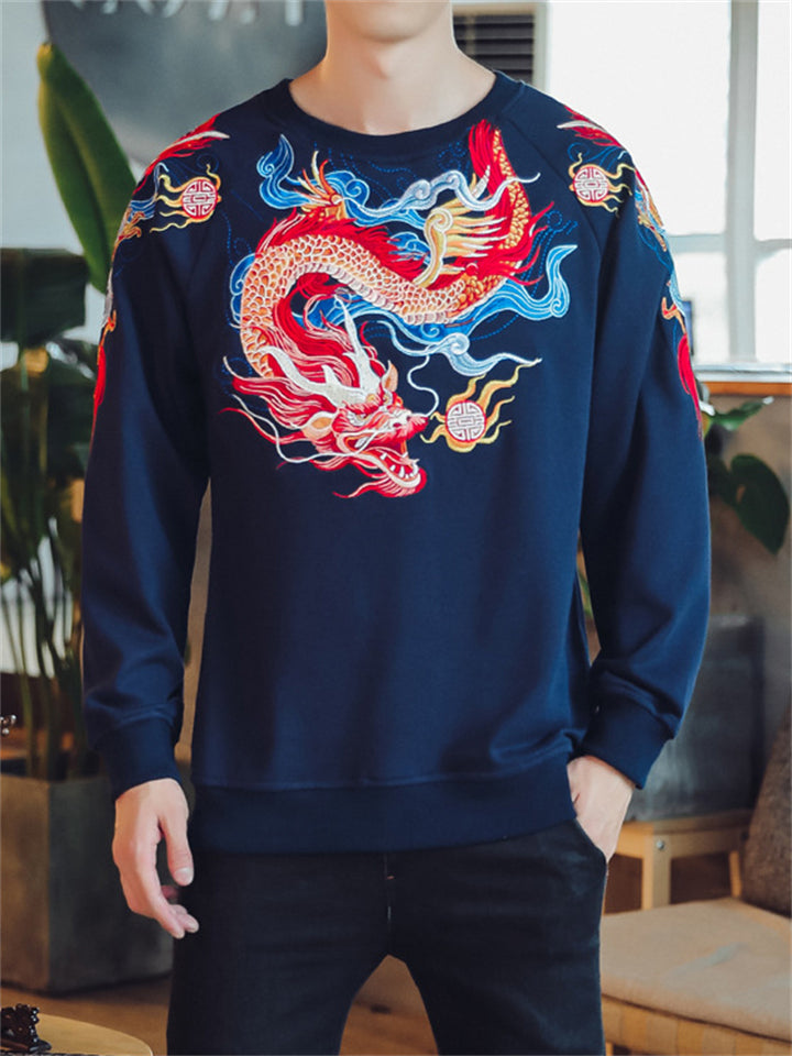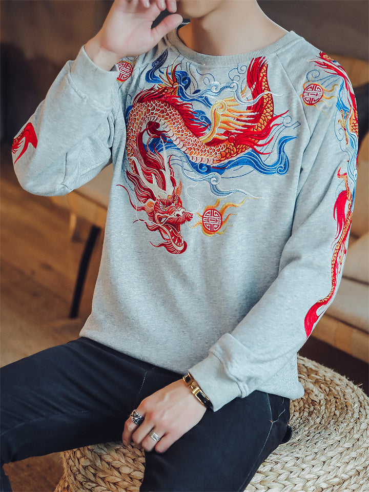 Flying Loong Embroidery Long Sleeve Round Neck Shirt