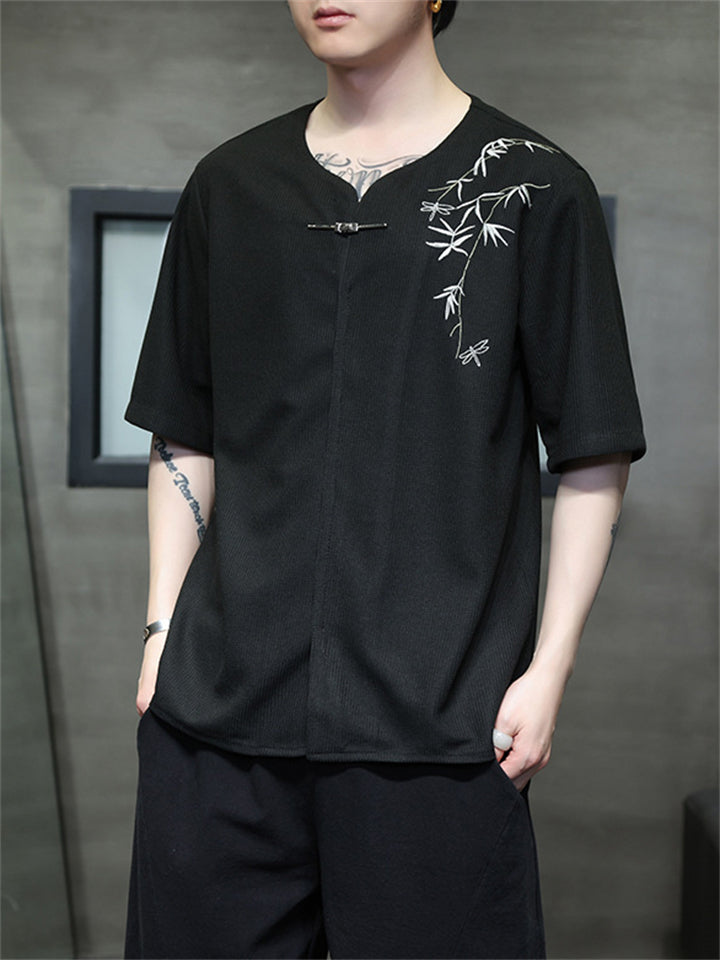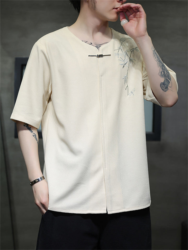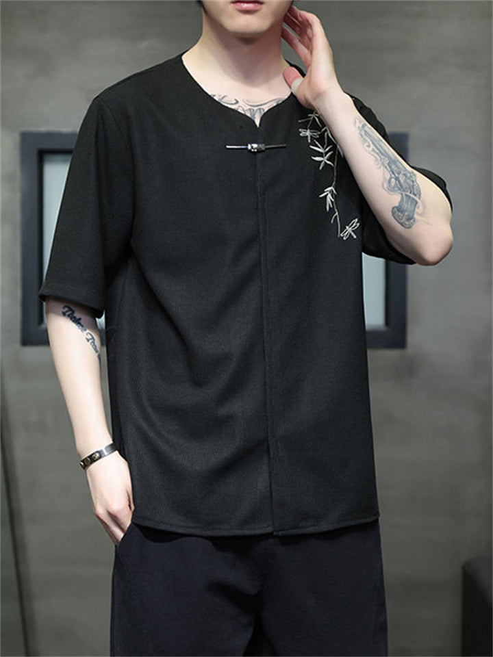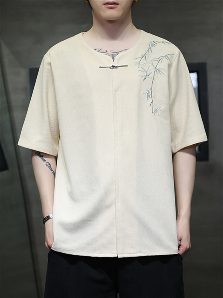Male Bamboo Embroidered Half Sleeve Metal Button Shirt