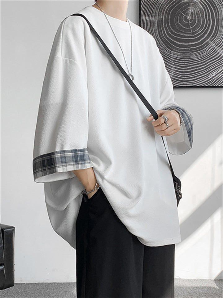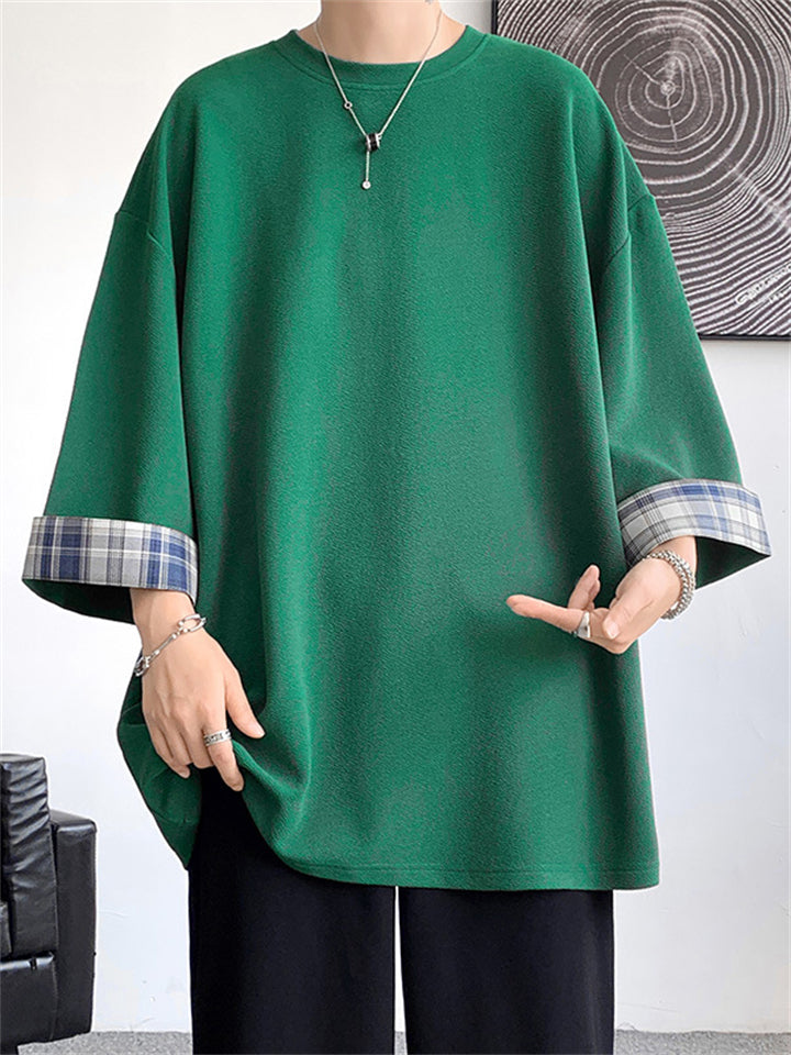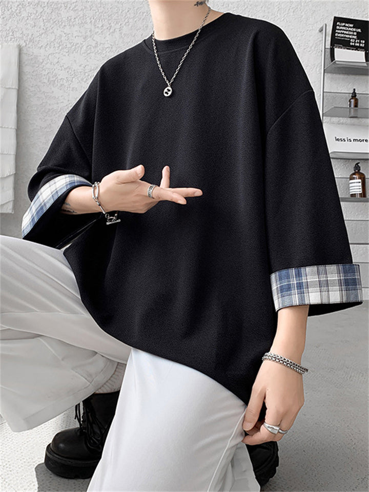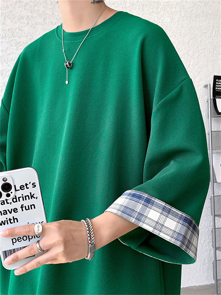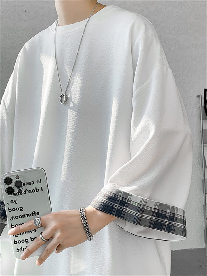 Male Summer Plaid Patchwork Shirt with 3/4 Sleeves