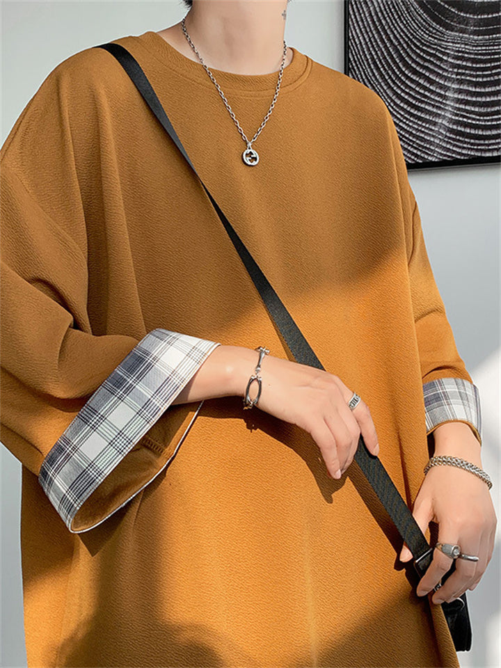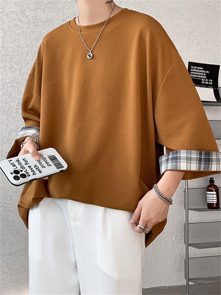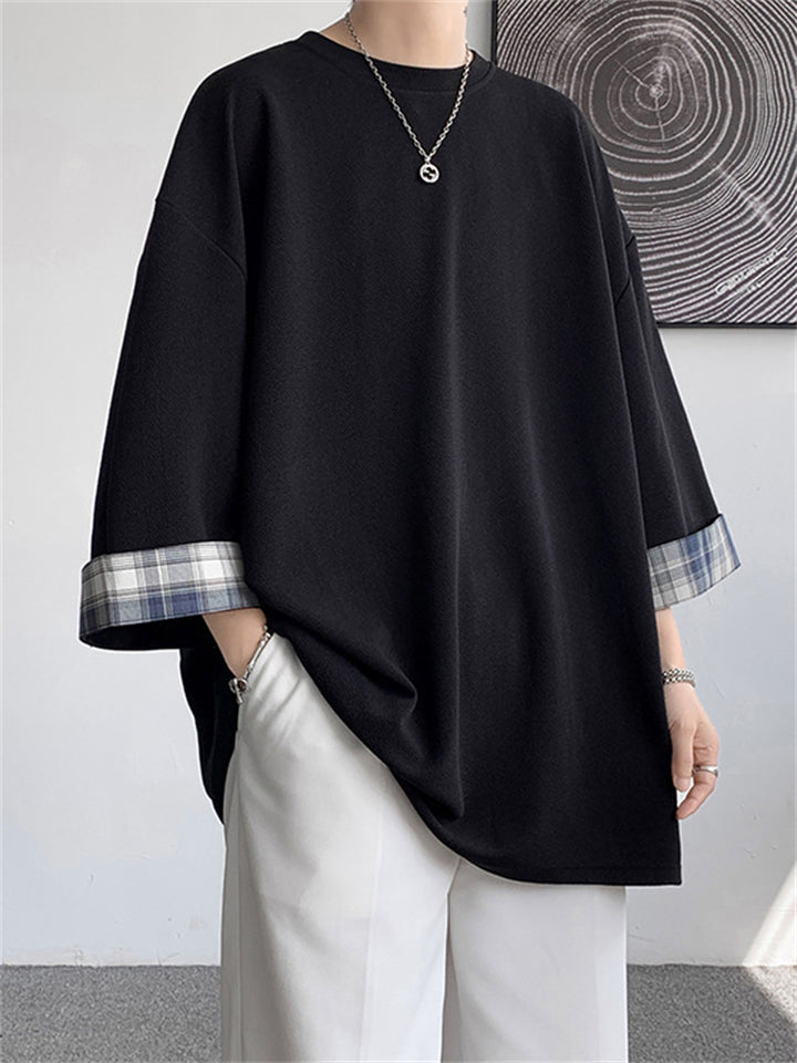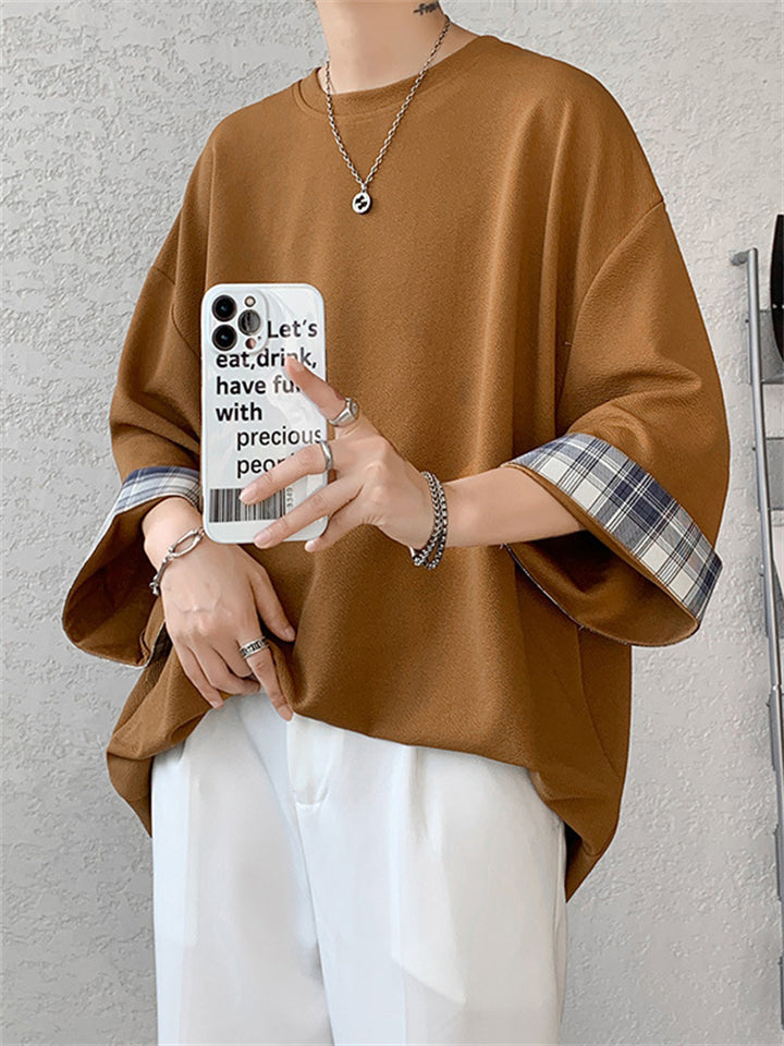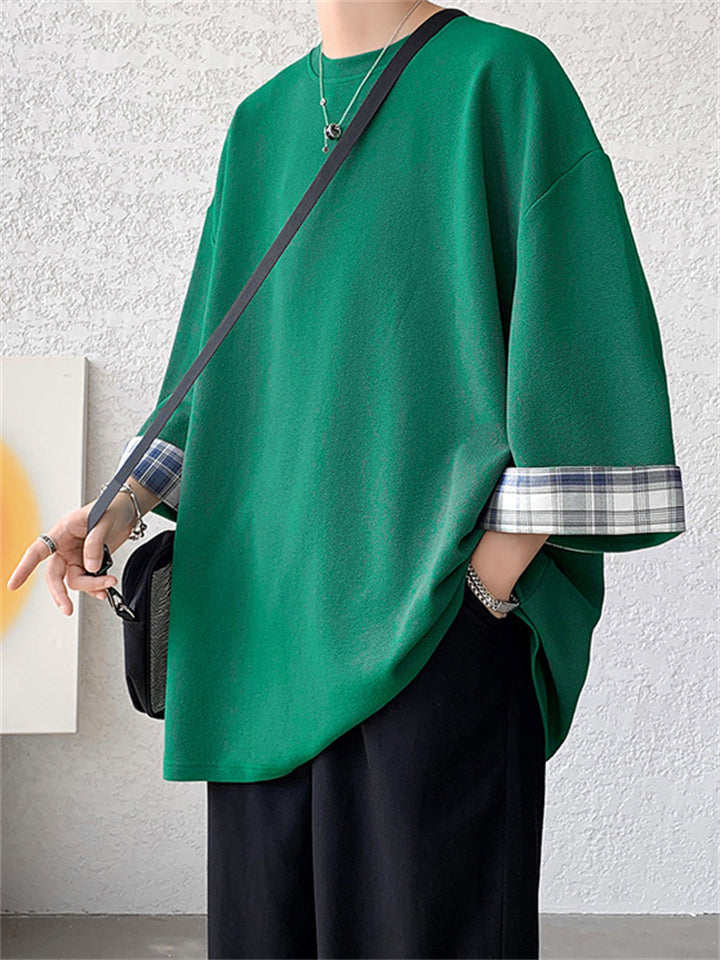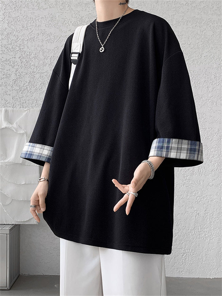 Male Summer Plaid Patchwork Shirt with 3/4 Sleeves
