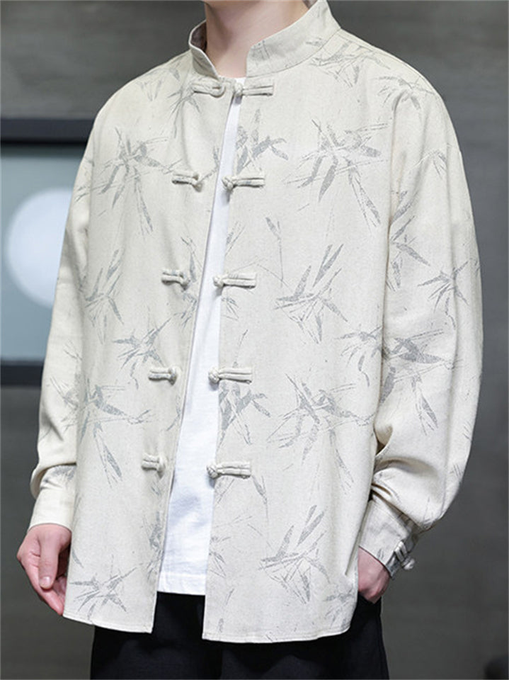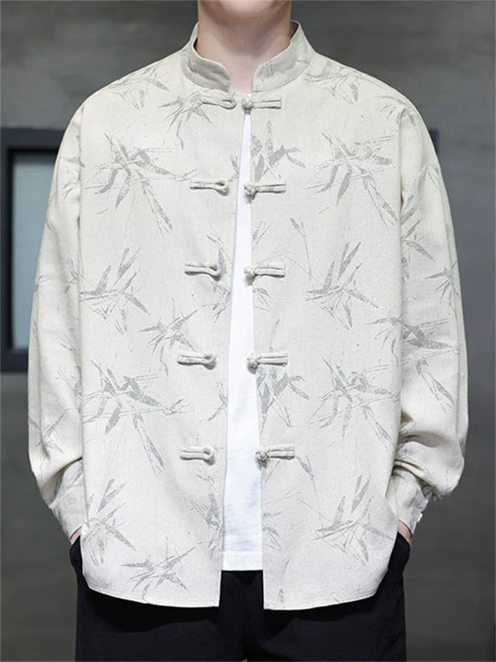 Men Chinese Style Long Sleeve Loose Fit Shirt with Bamboo Leaf Print