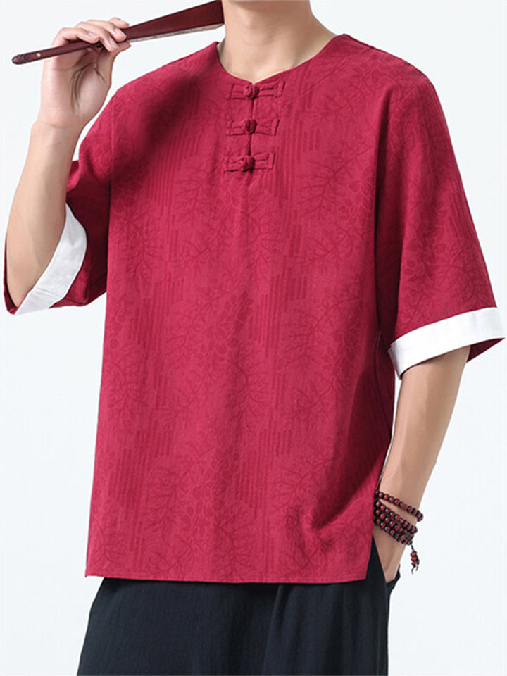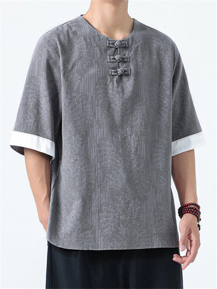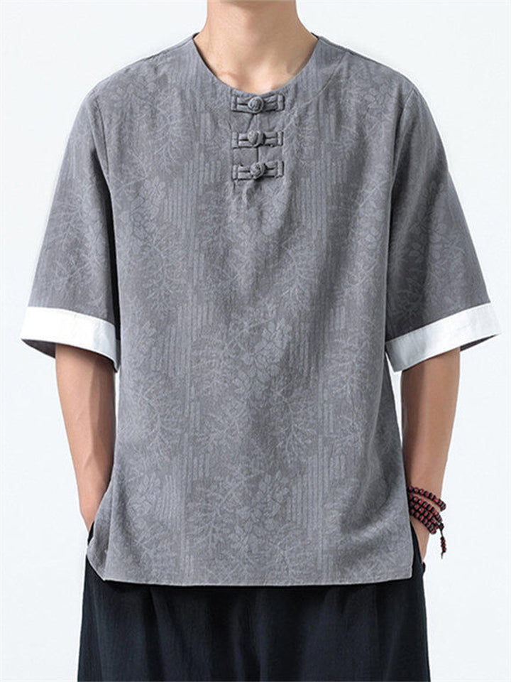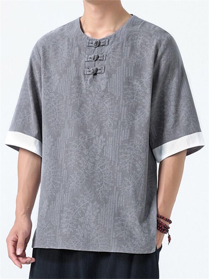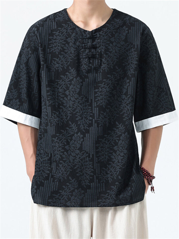 Men's Casual Chinese Style Print Round Collar Half Sleeve Shirt