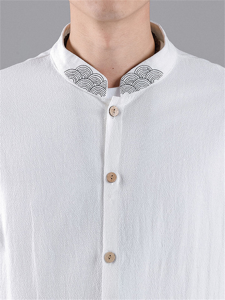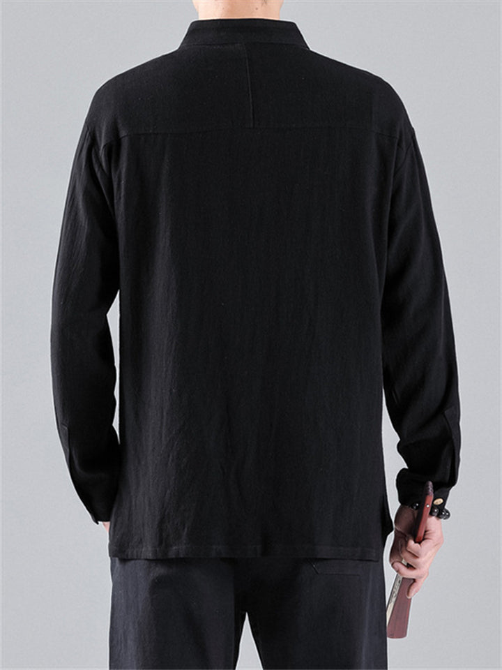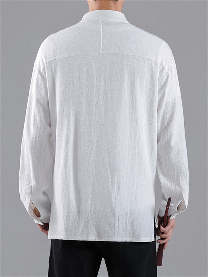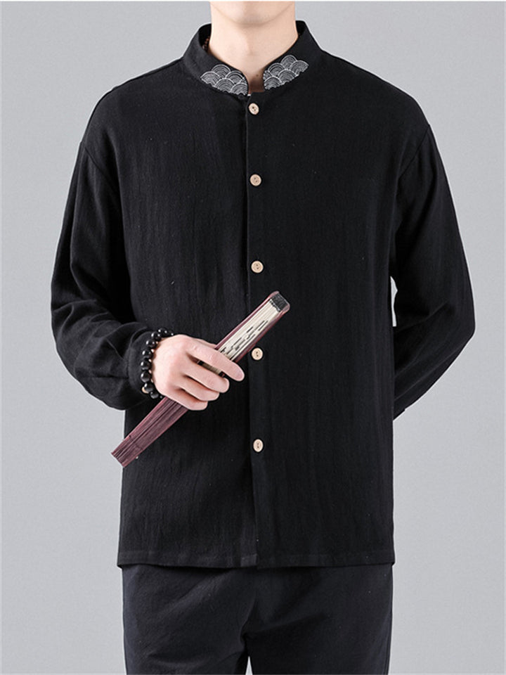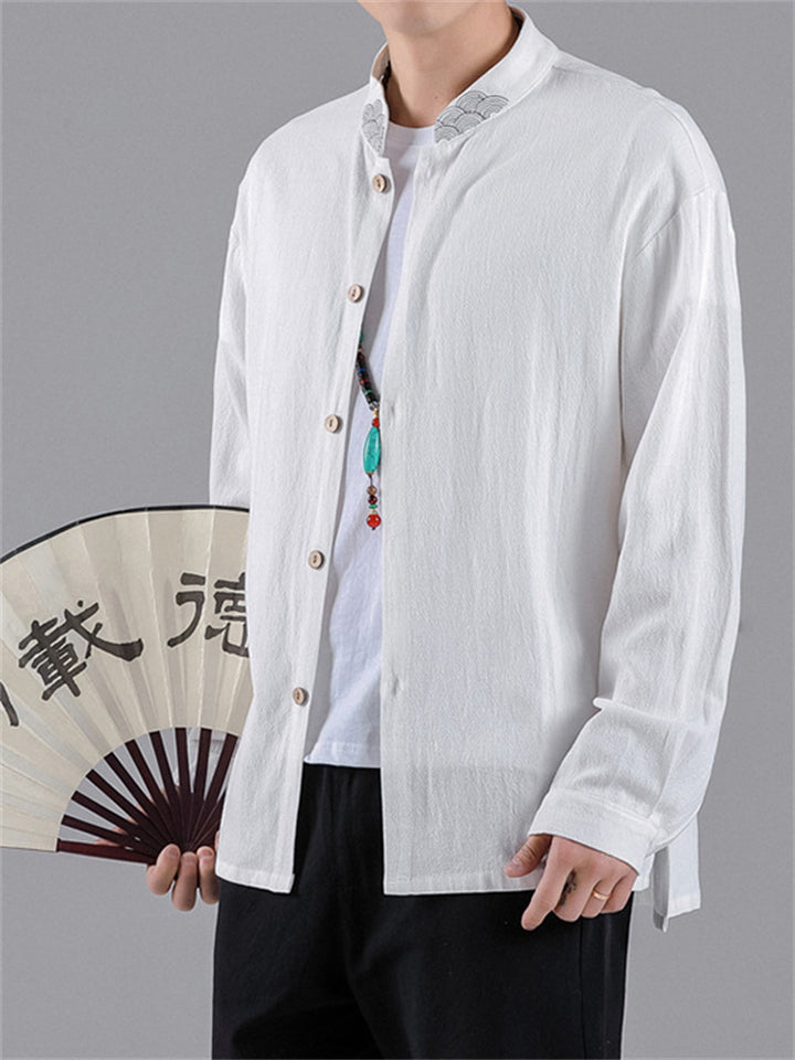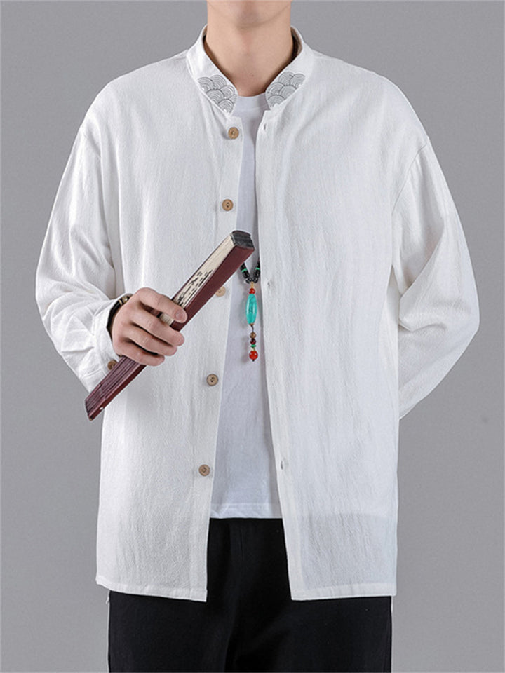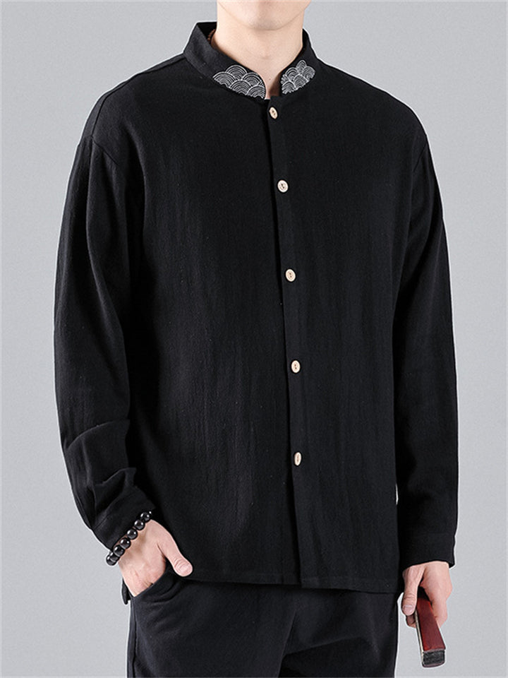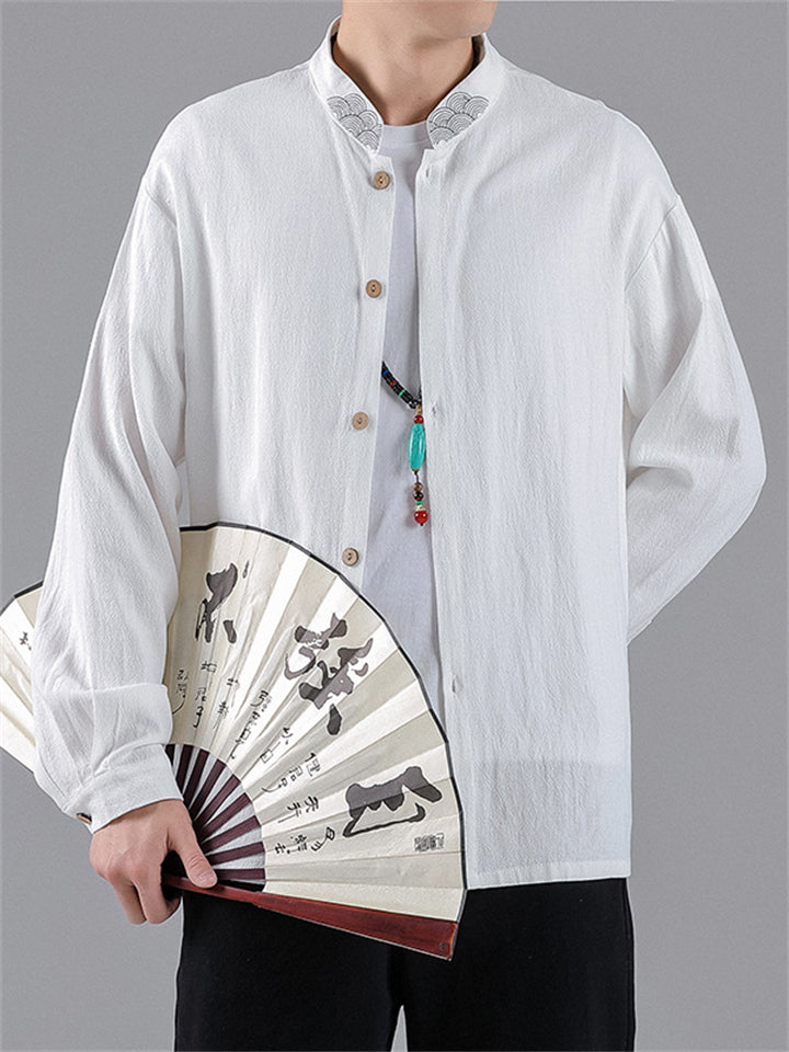 Men's Casual Embroidery Stand Collar Linen Long Sleeve Shirt