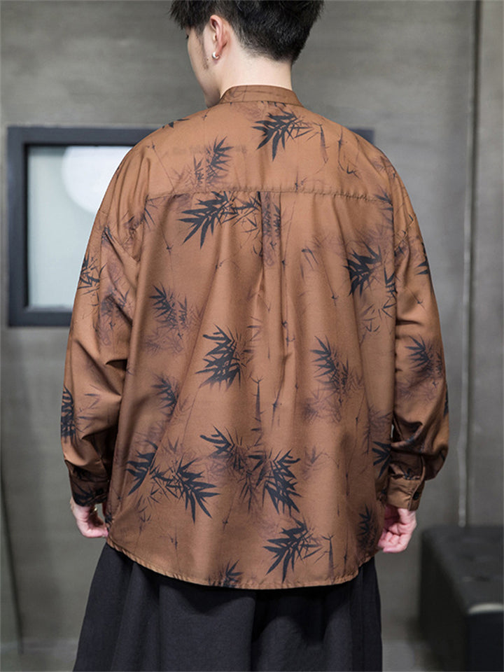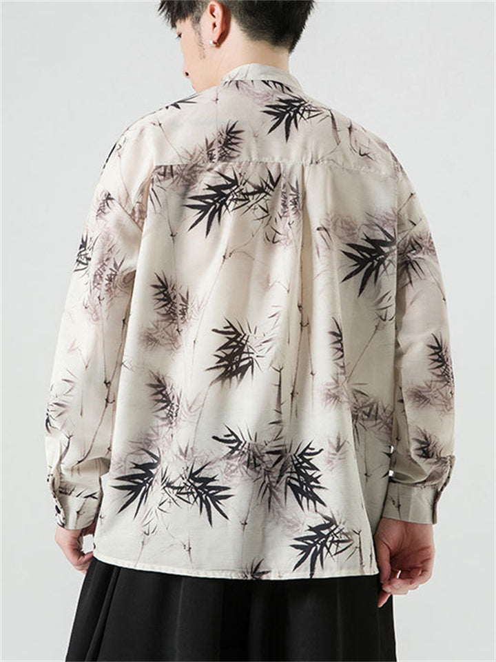 Men's Summer Bamboo Leaves Printed Stand Collar Short Sleeve TangSuit Shirts