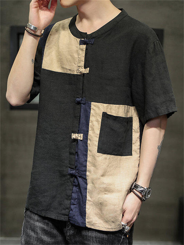Men's Chinese Style Contrast Color Pockets Round Neck Shirts