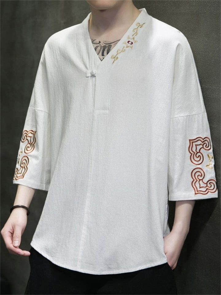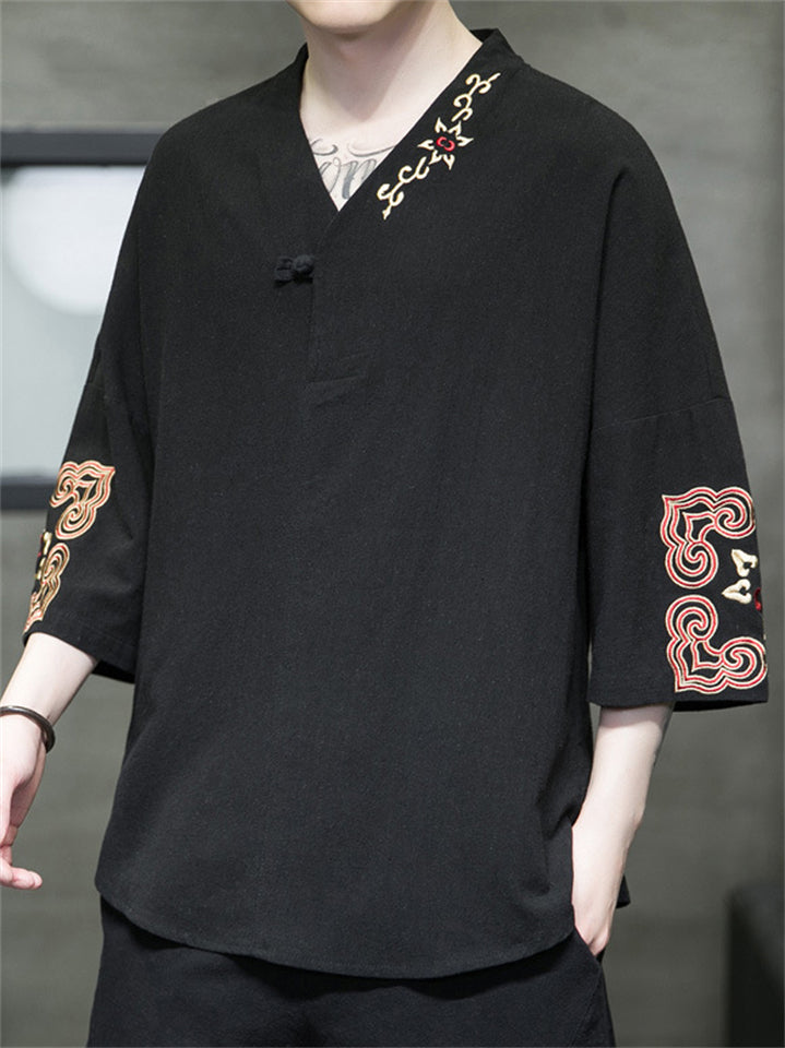 Men's Chinese Style Embroidered 3/4 Sleeve Hanfu TangSuit Shirt