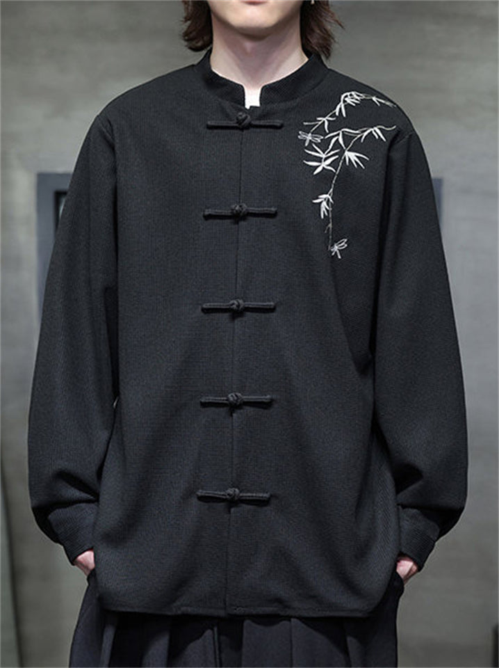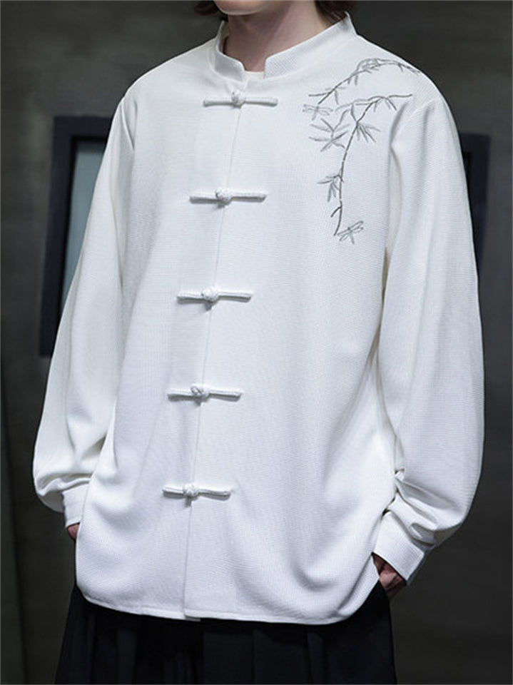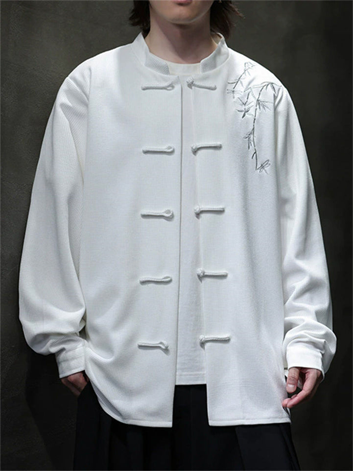 Men's Chinese Style Embroidered Waffle Long Sleeve Tang Suit Shirts