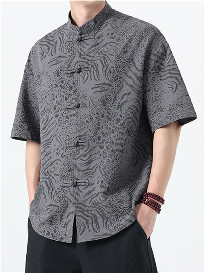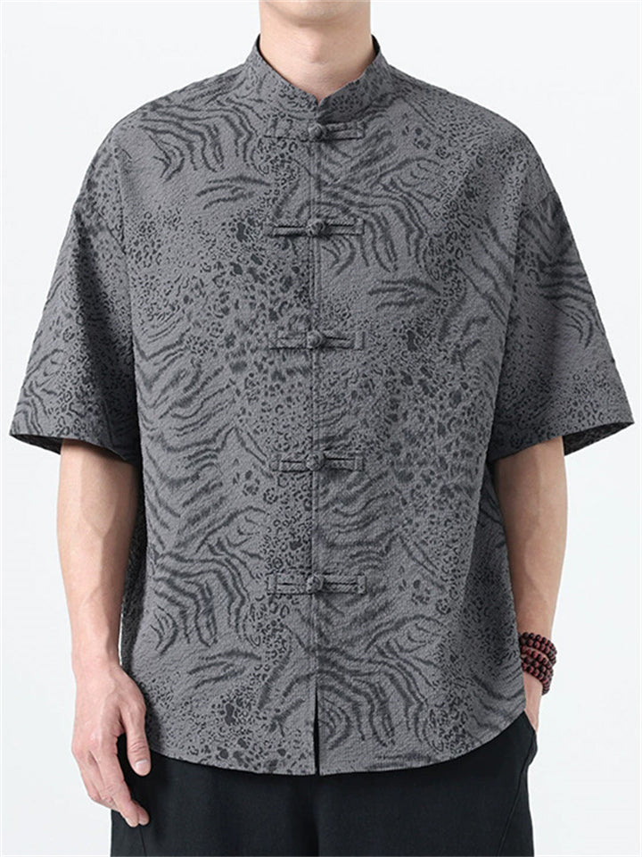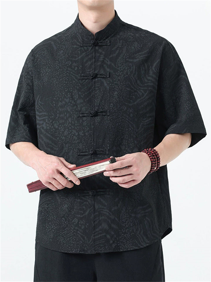 Men's Chinese Style Jacquard Loose Stand Collar Summer Short Sleeve Shirts