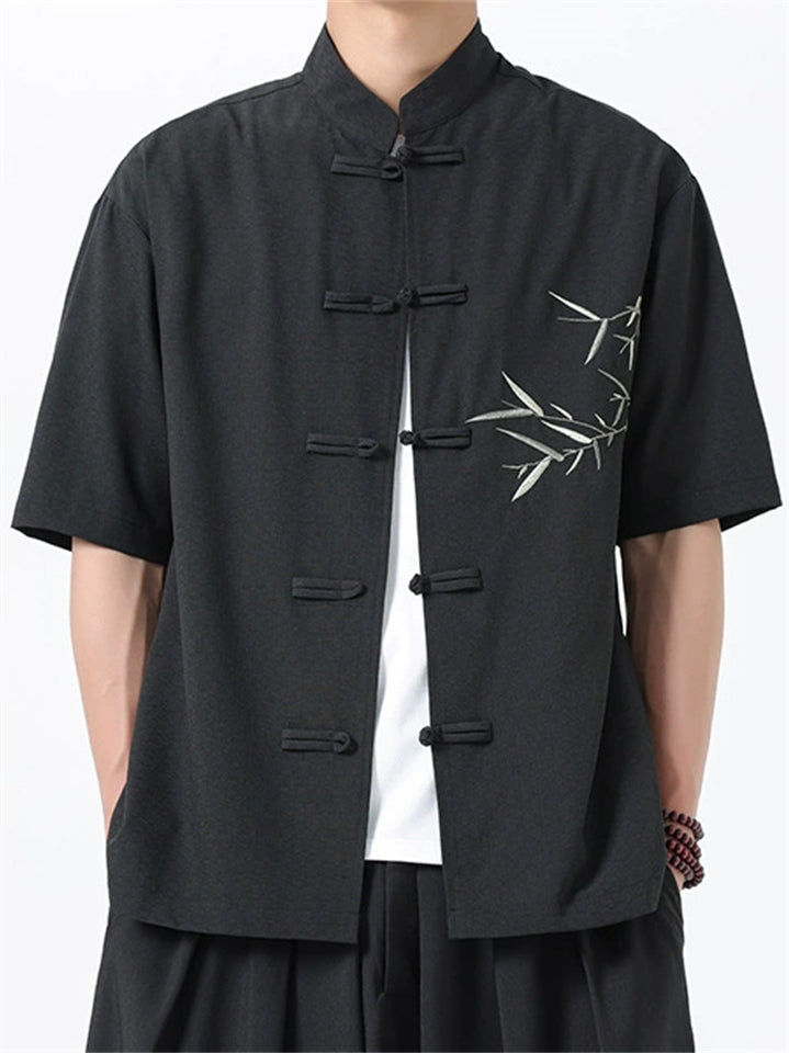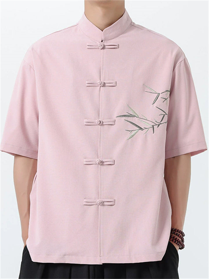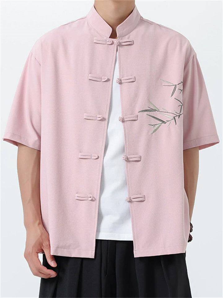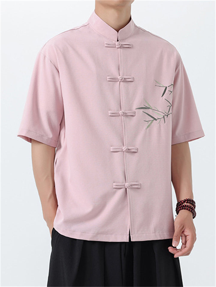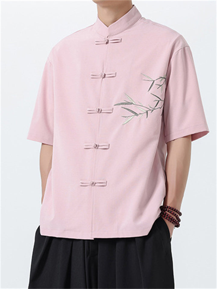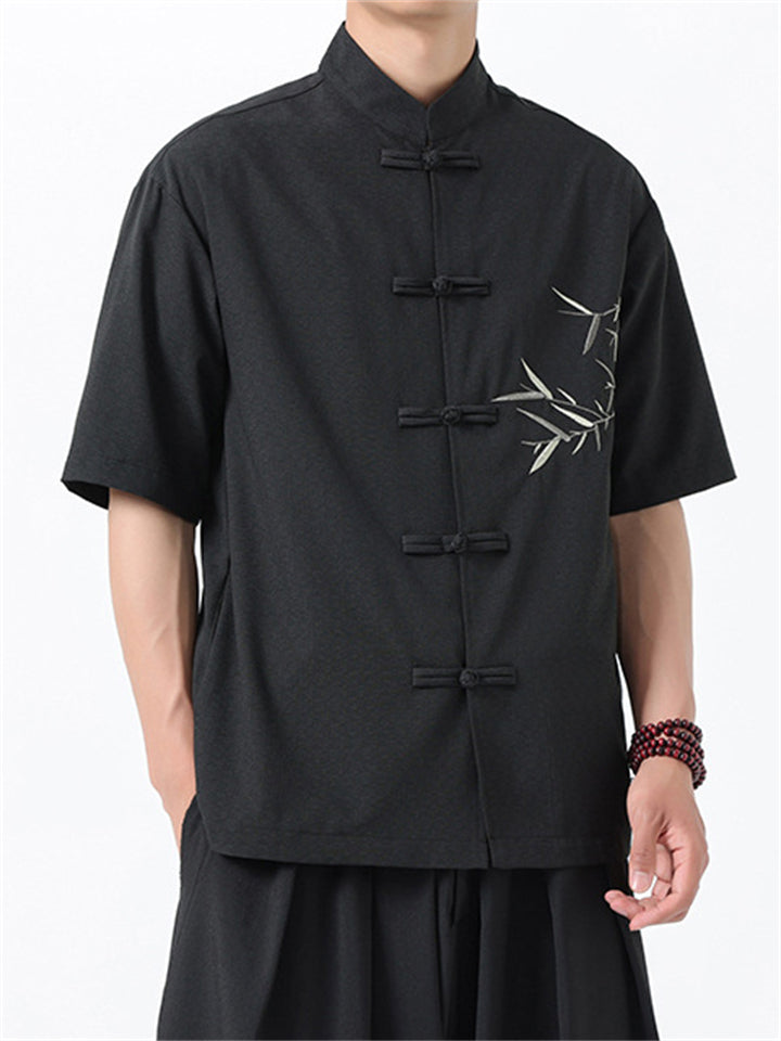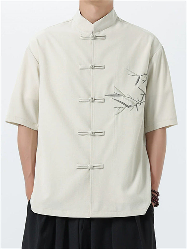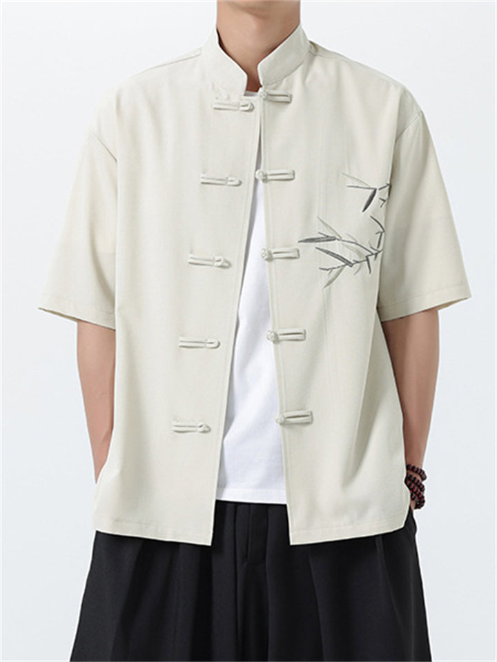 Men's Summer Bamboo Leaves Printed Stand Collar Short Sleeve TangSuit Shirts
