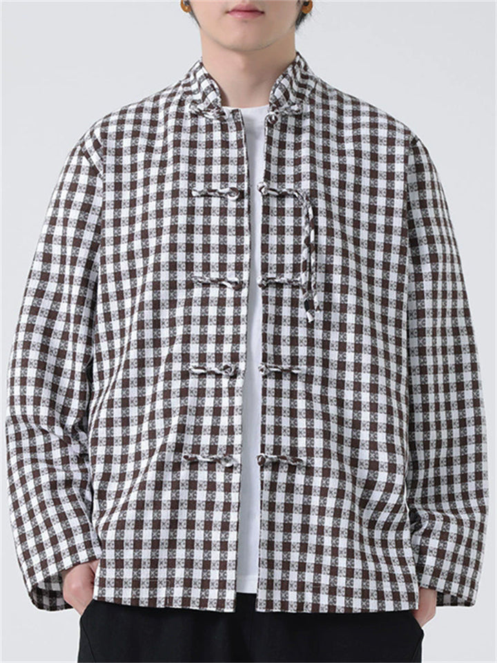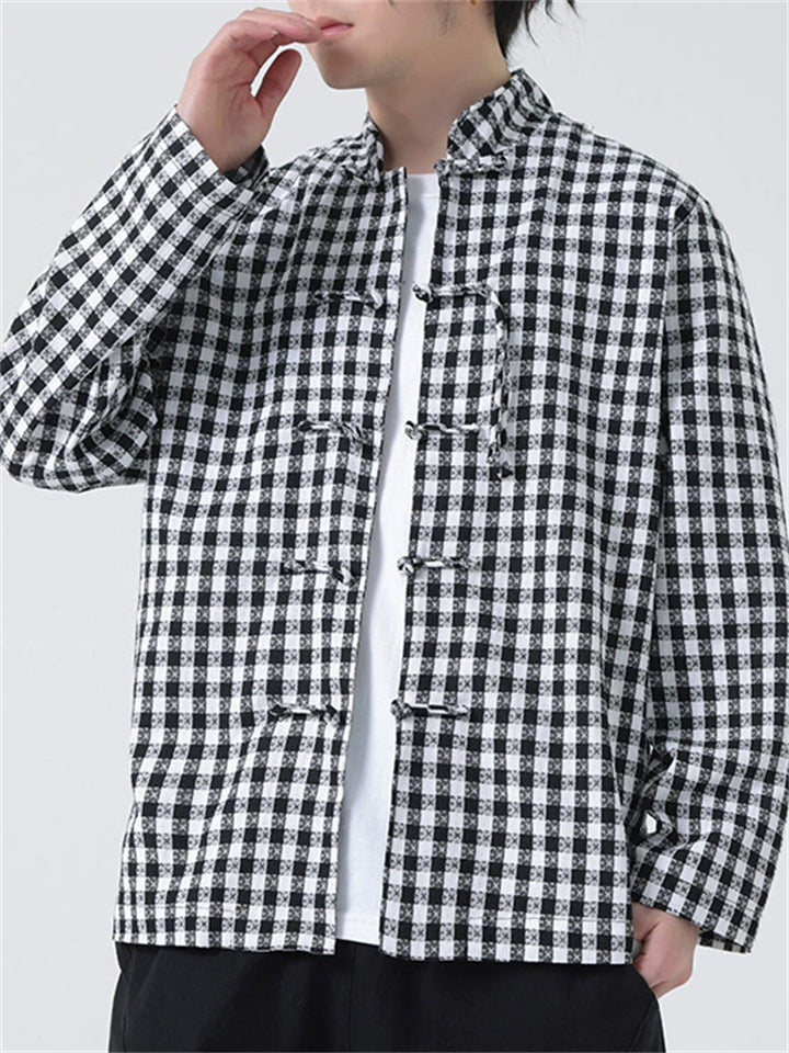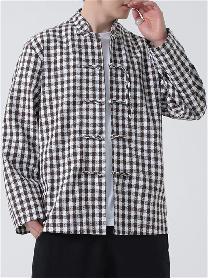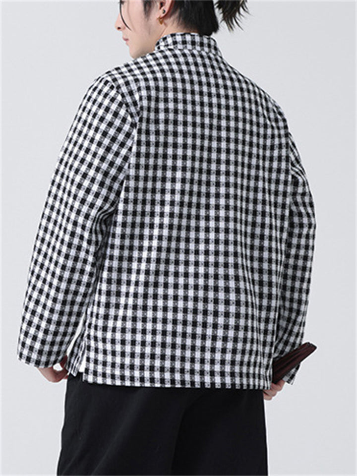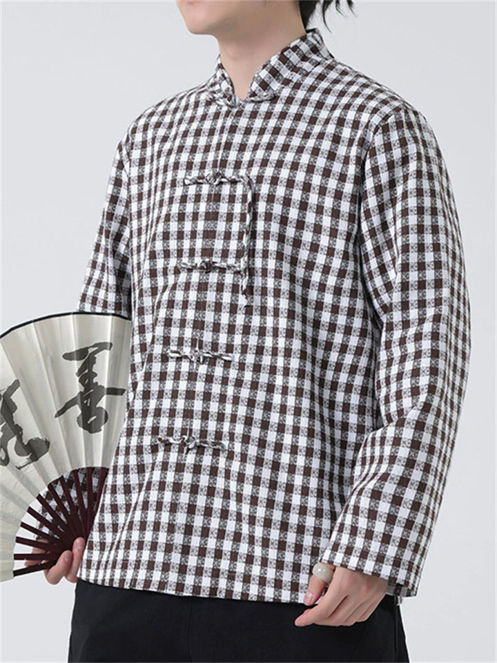 Men's Chinese Style Stand Collar Long Sleeve Linen Plaid Shirt