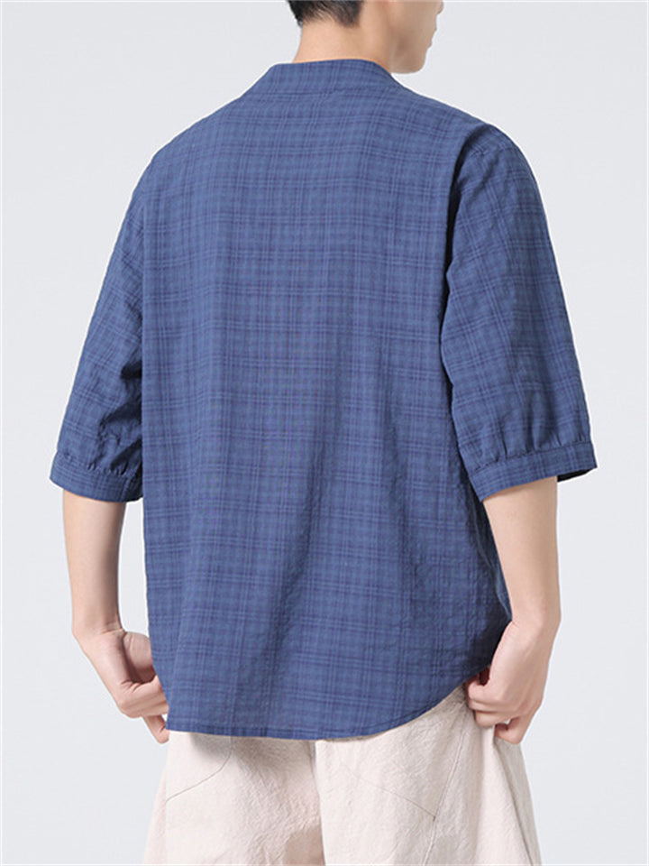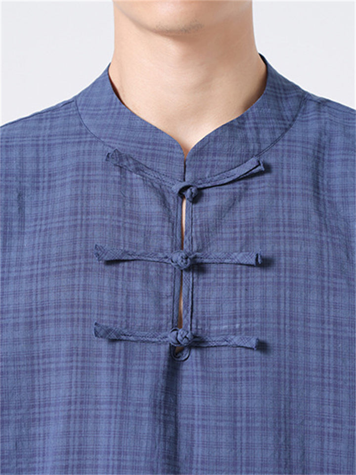 Men's Chinese Style Stand Collar Short Sleeve Linen Plaid Shirt