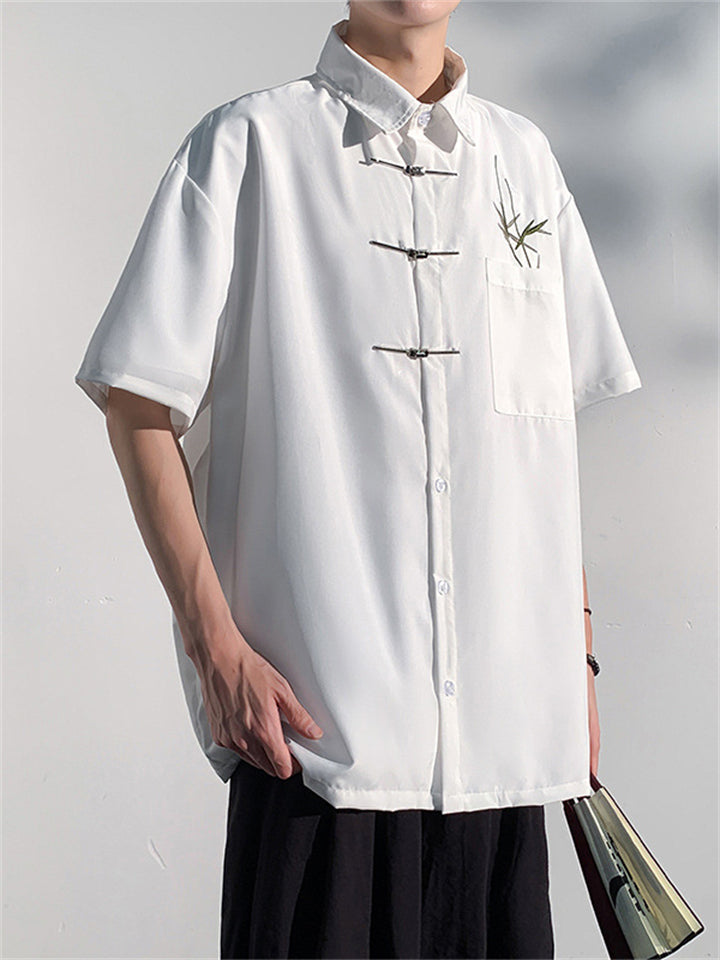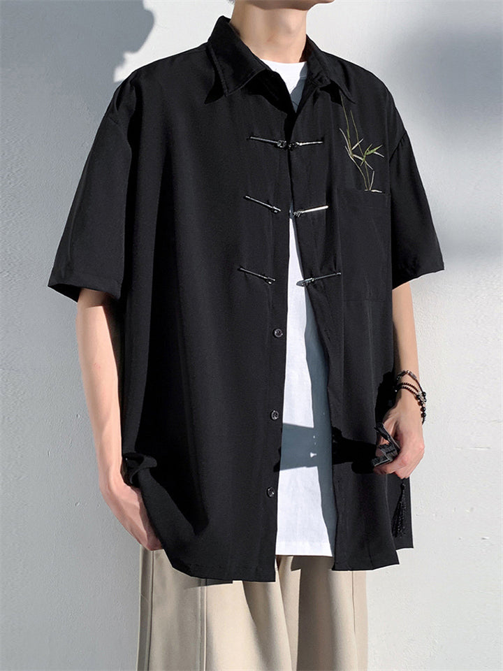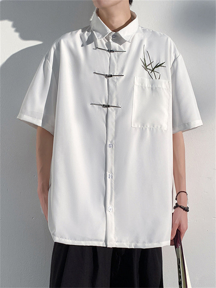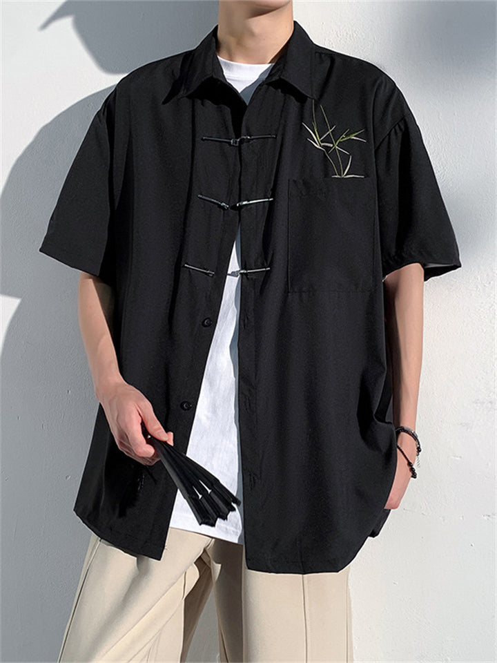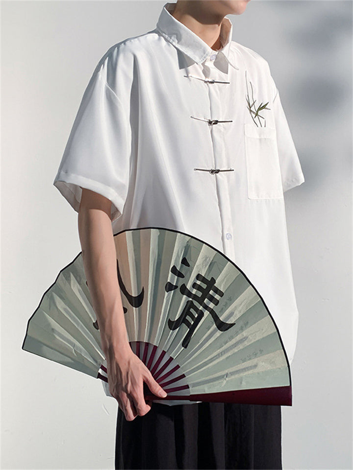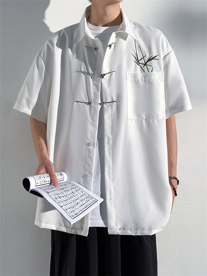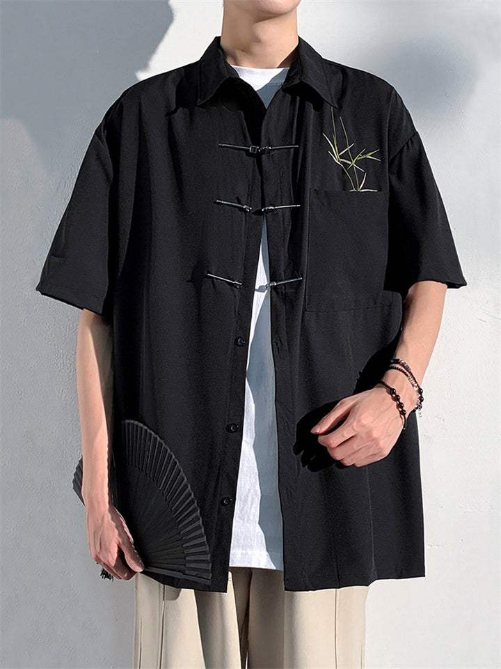 Men's Summer Bamboo Leaves Printed Stand Collar Short Sleeve TangSuit Shirts