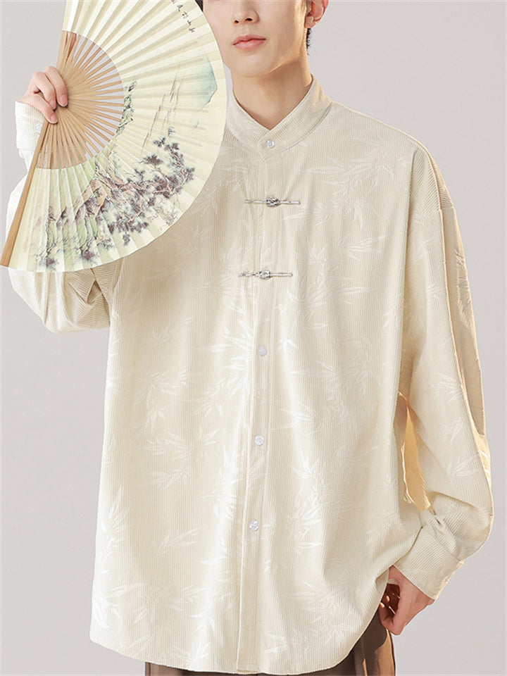 Men's Summer Bamboo Leaves Printed Stand Collar Short Sleeve TangSuit Shirts