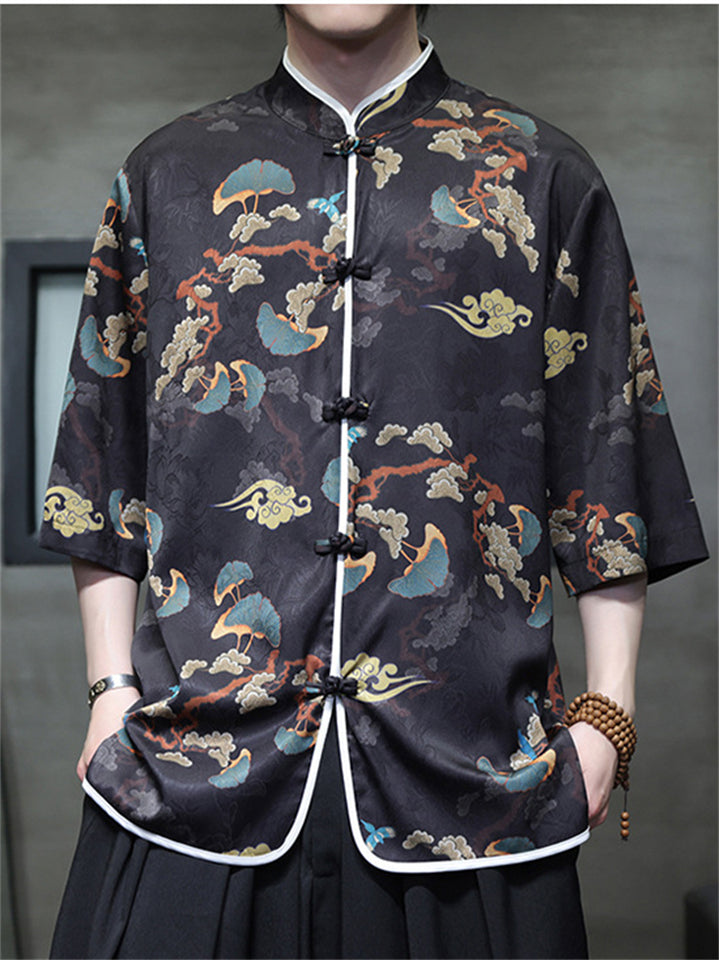 Men's Summer Bamboo Leaves Printed Stand Collar Short Sleeve TangSuit Shirts