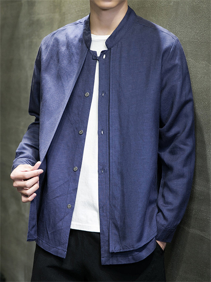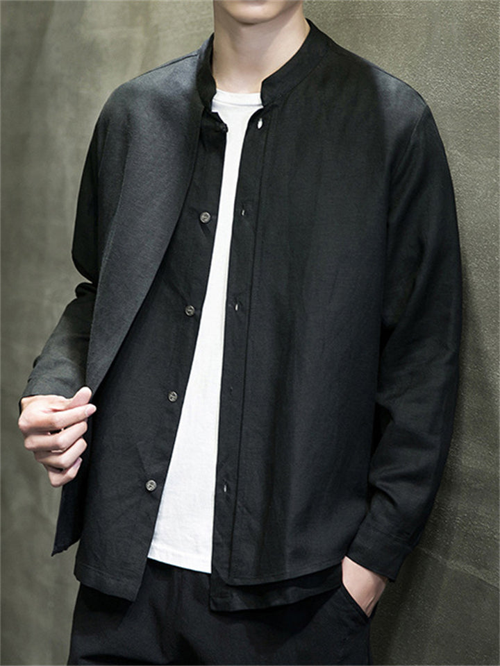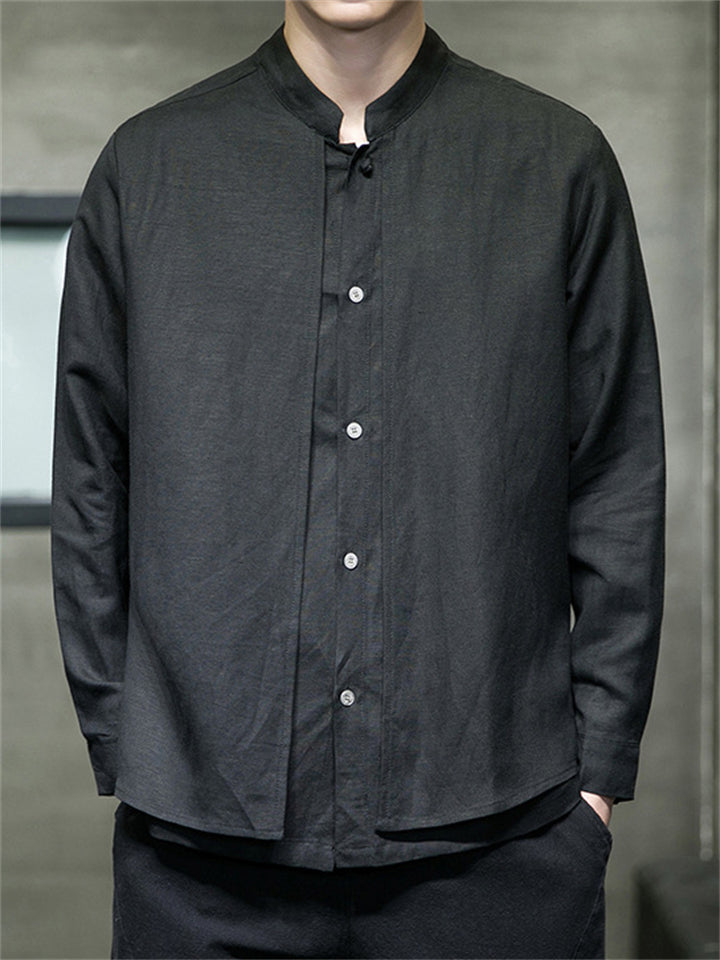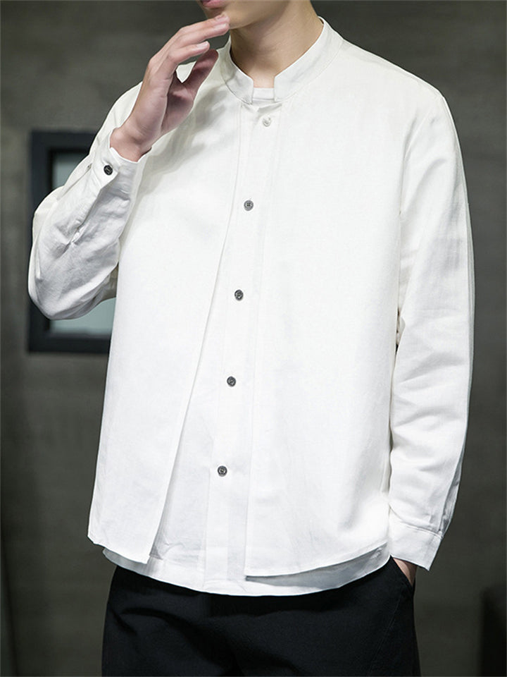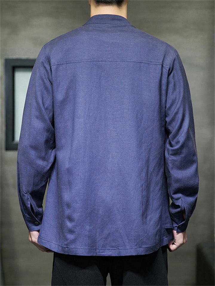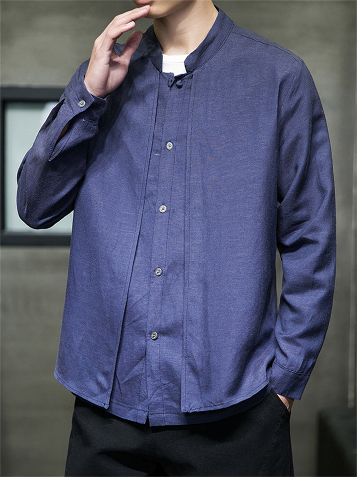 Men's Solid Color Cotton Linen Stand Collar Pullover Long Sleeve Shirts