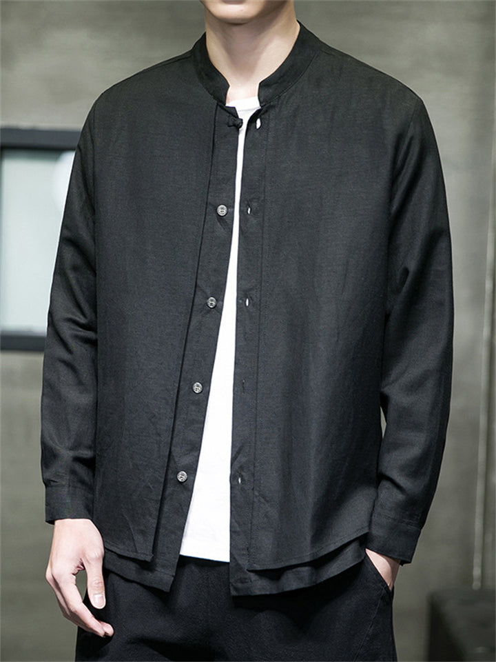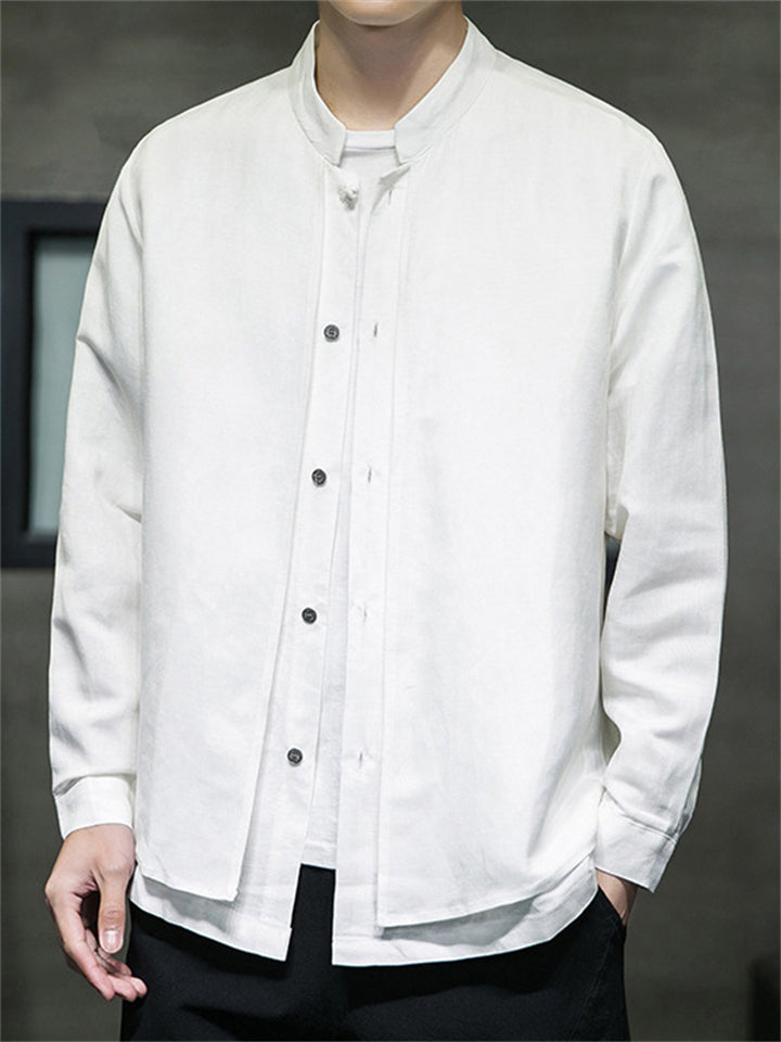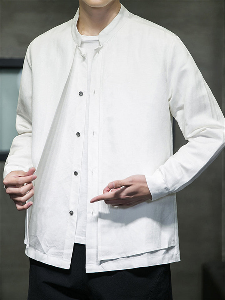 Men's Fake Two Pieces Stand Collar Button Linen Shirt