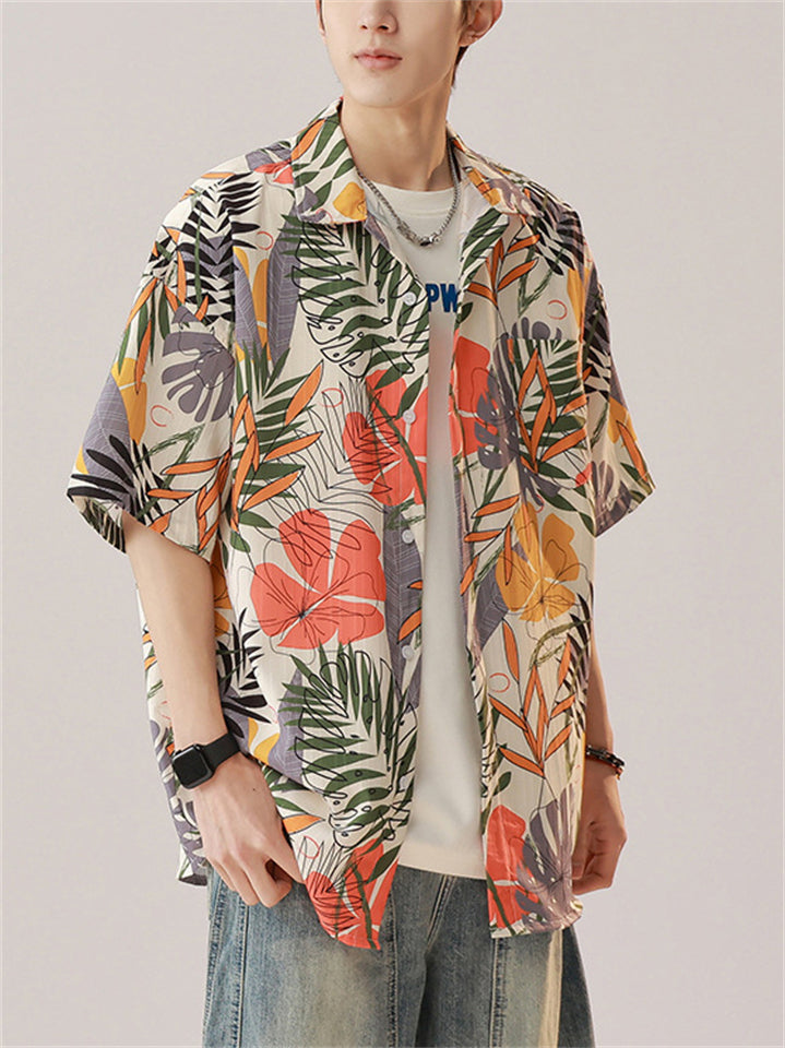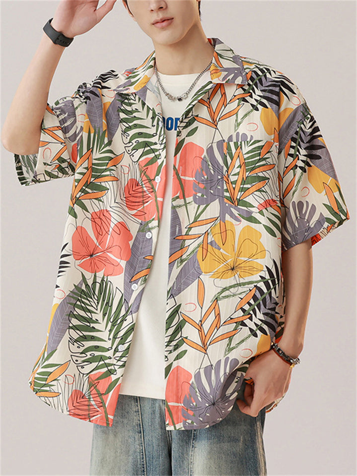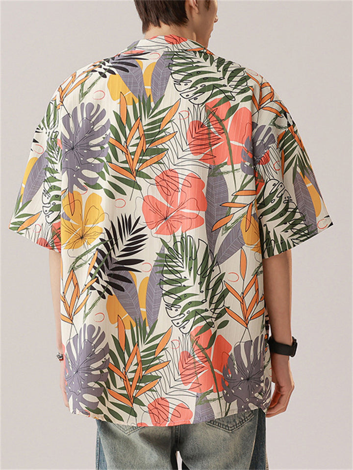 Men's Holiday Style Leaves Print Lapel Short Sleeve Beach Shirt