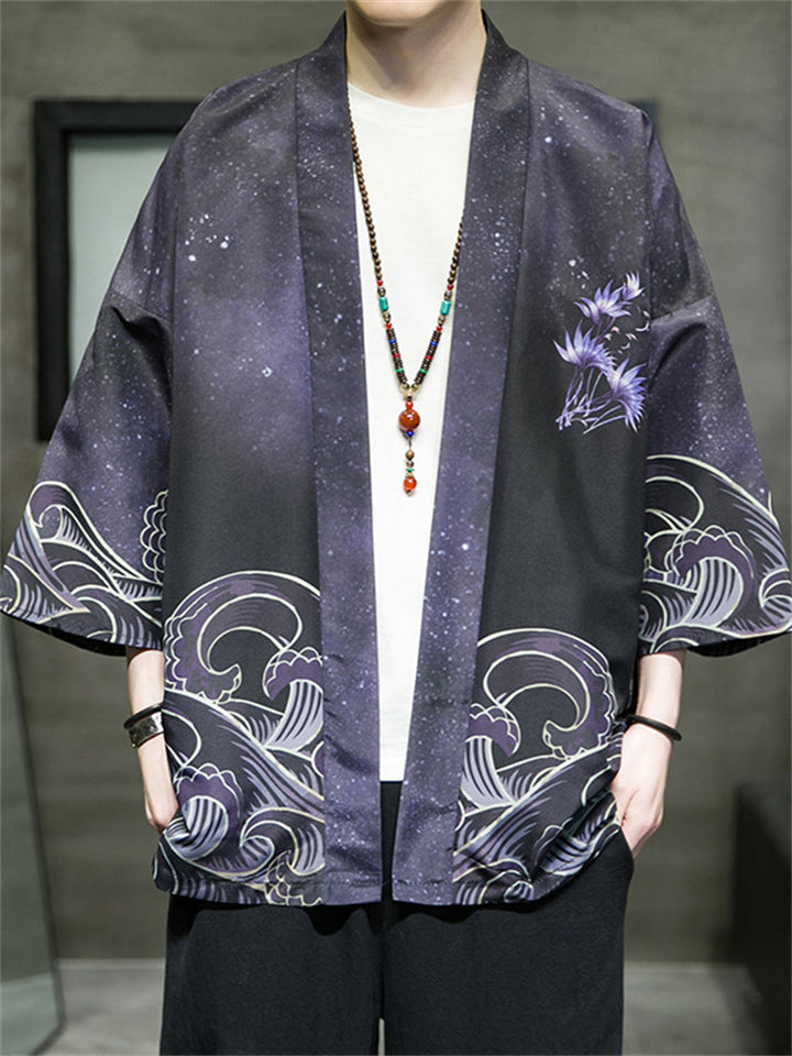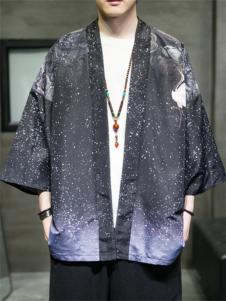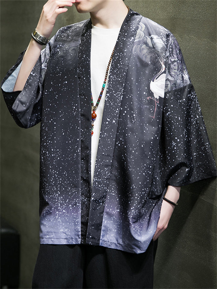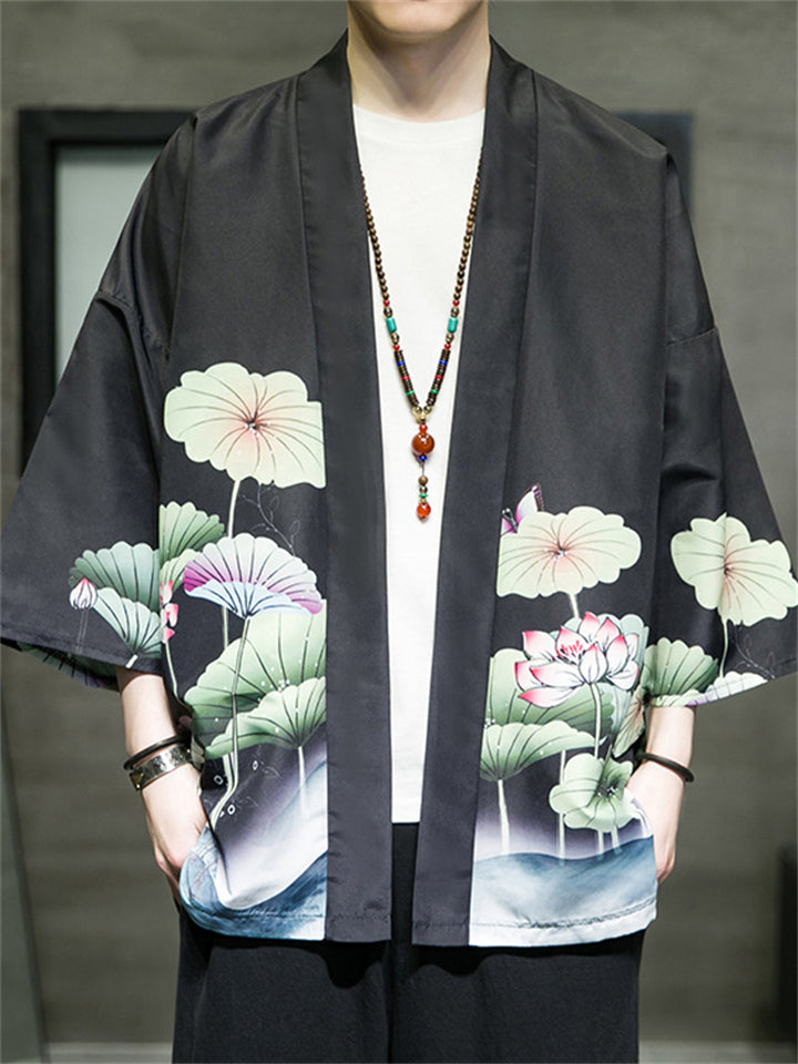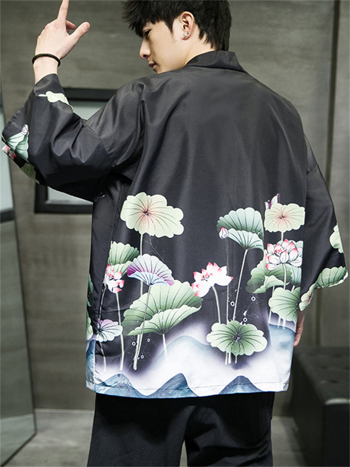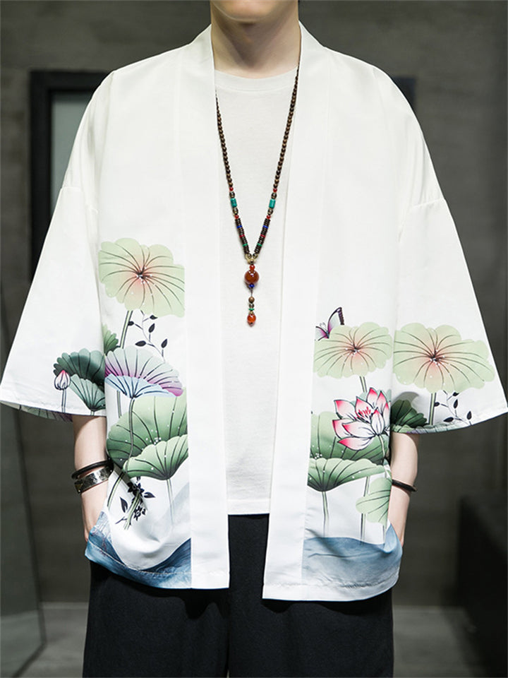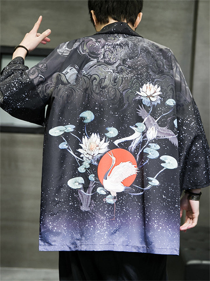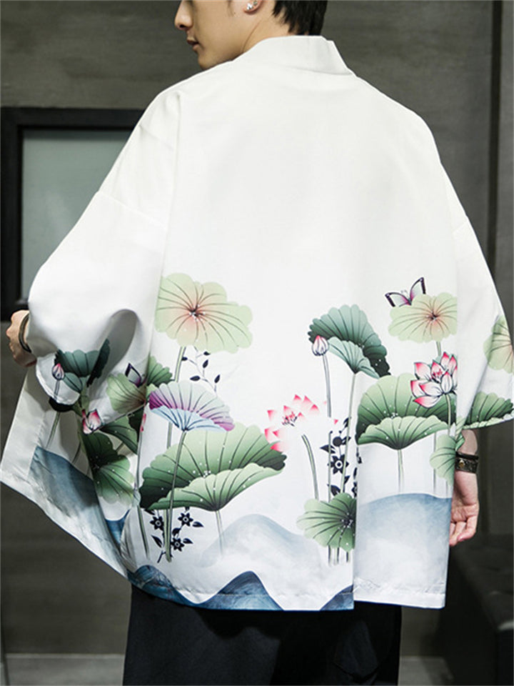 Men's Open Front Crane Flower Lotus Leaf Printed Shirts