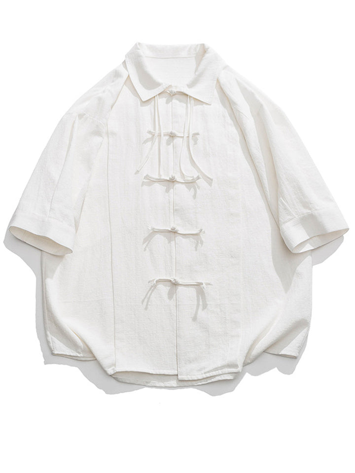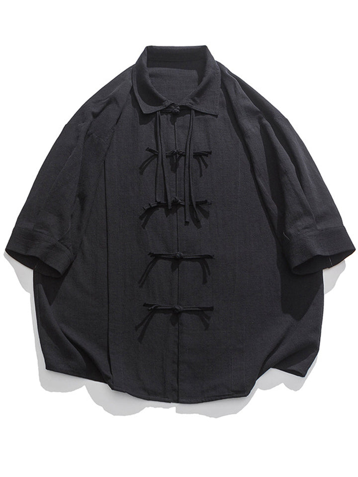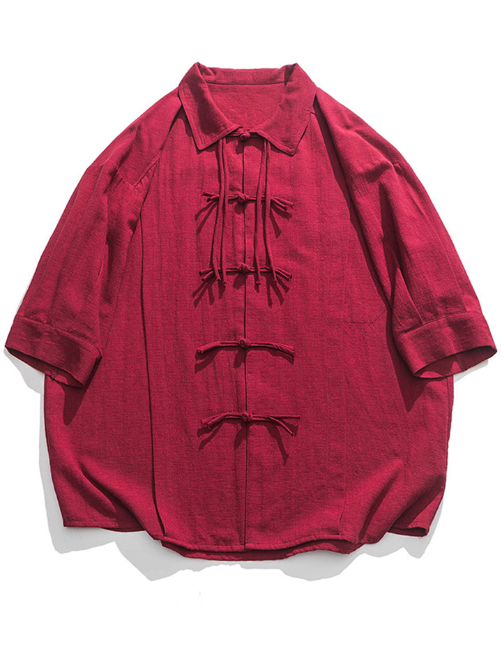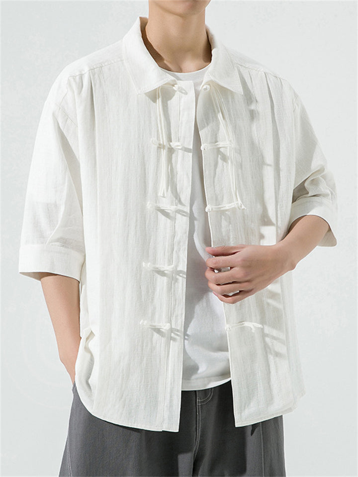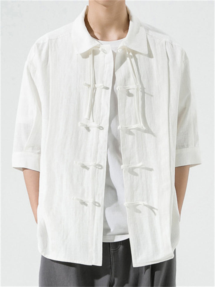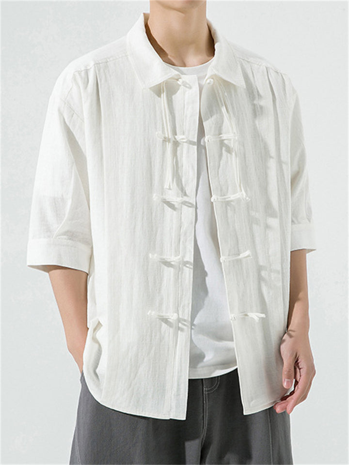 Men's Plain Cotton Linen Tassel Button Summer Tang Suit Shirt