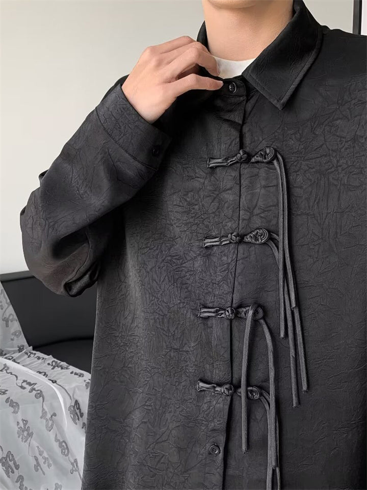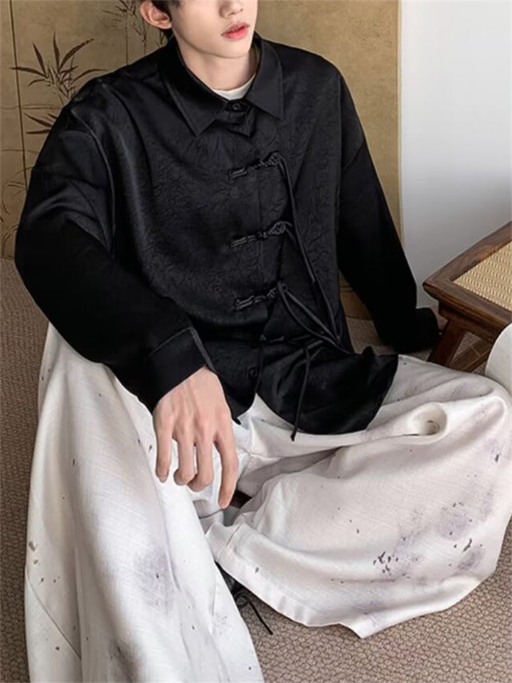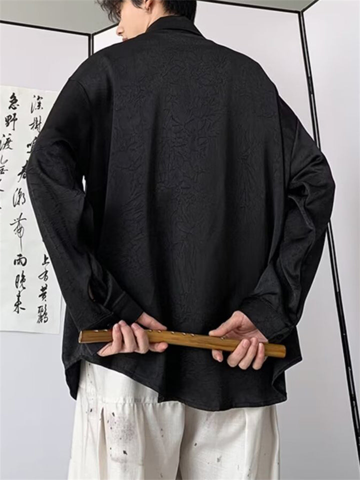 Men's Retro Tassel Button Black Lapel Long Sleeve Shirt