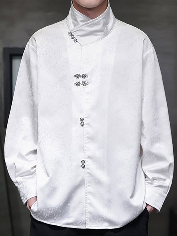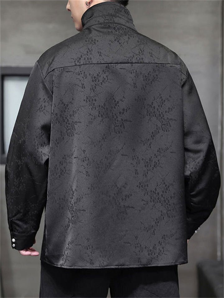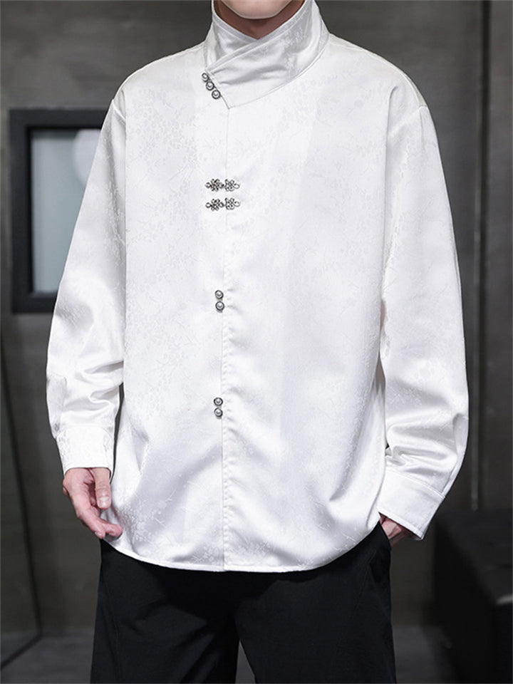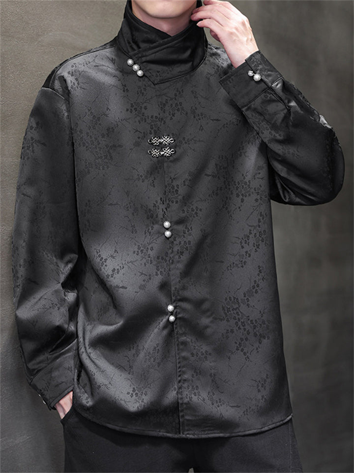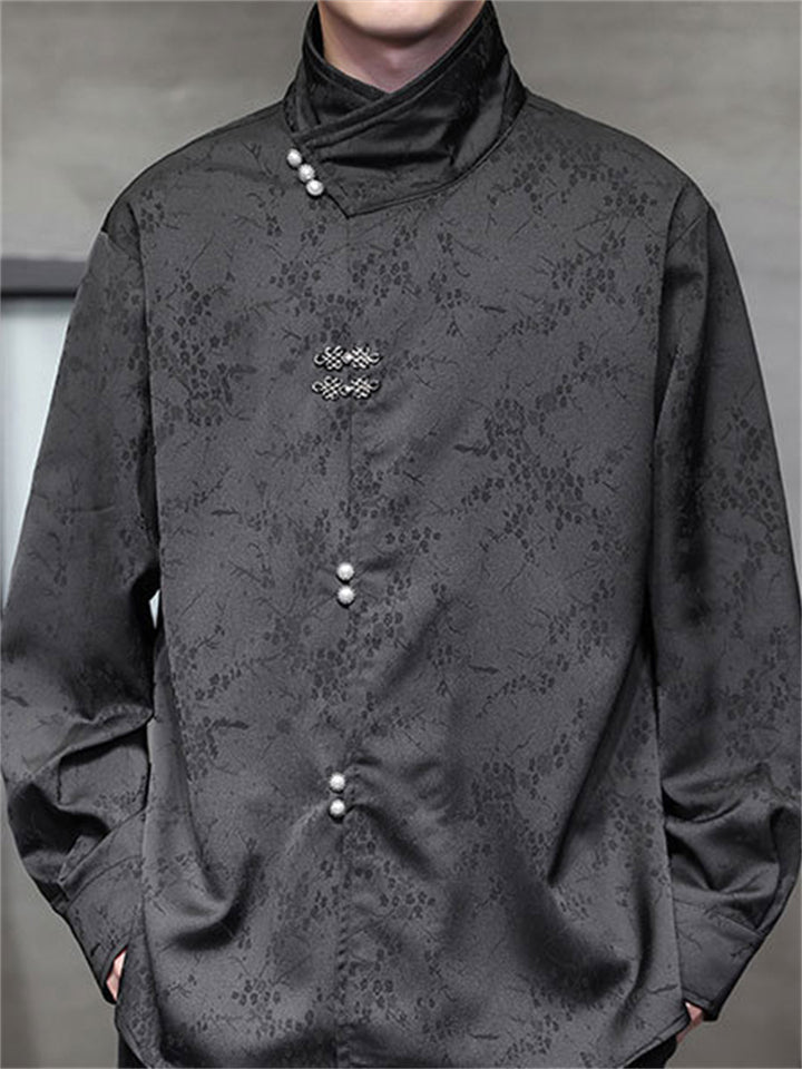 Men's Satin Jacquard Stand Collar Shirt with Metal Buttons