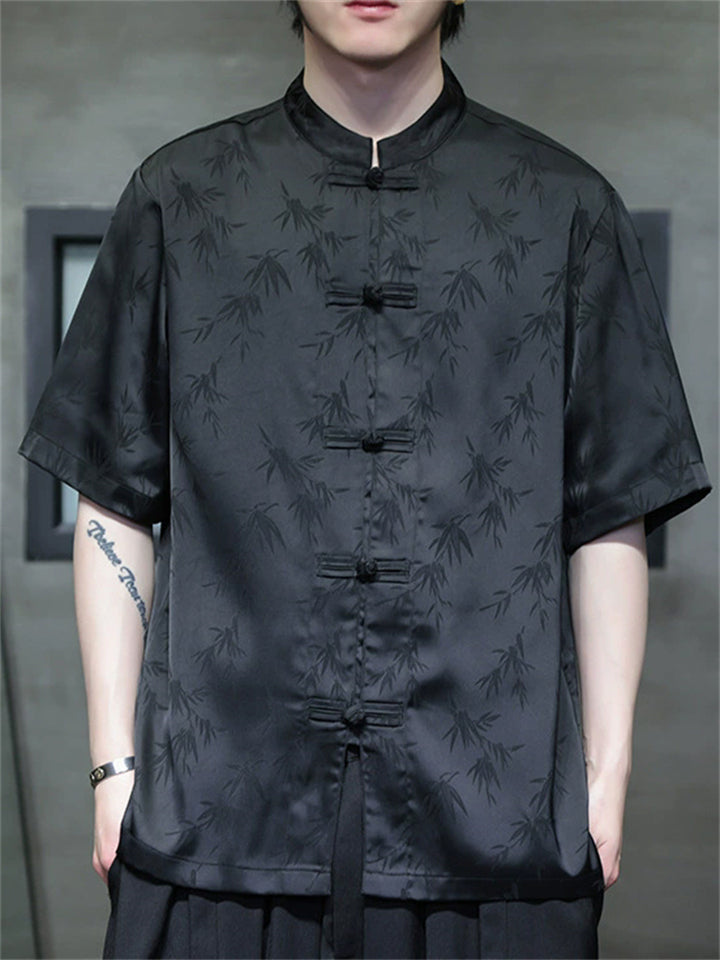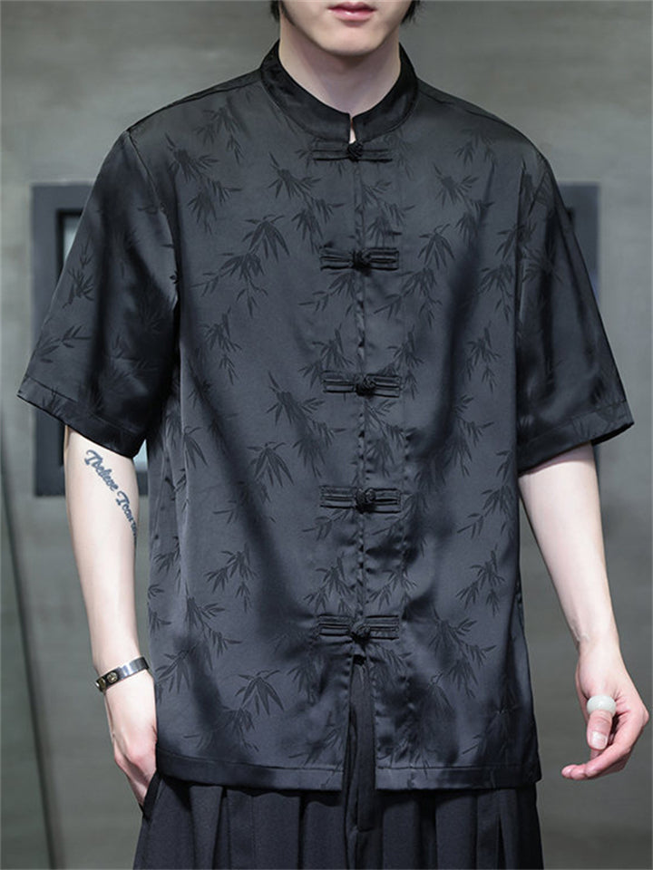 Men's Summer Bamboo Leaves Printed Stand Collar Short Sleeve TangSuit Shirts