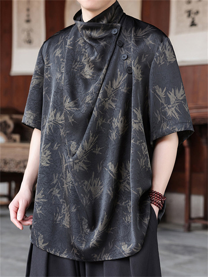 Men's Summer Bamboo Leaves Printed Stand Collar Short Sleeve TangSuit Shirts