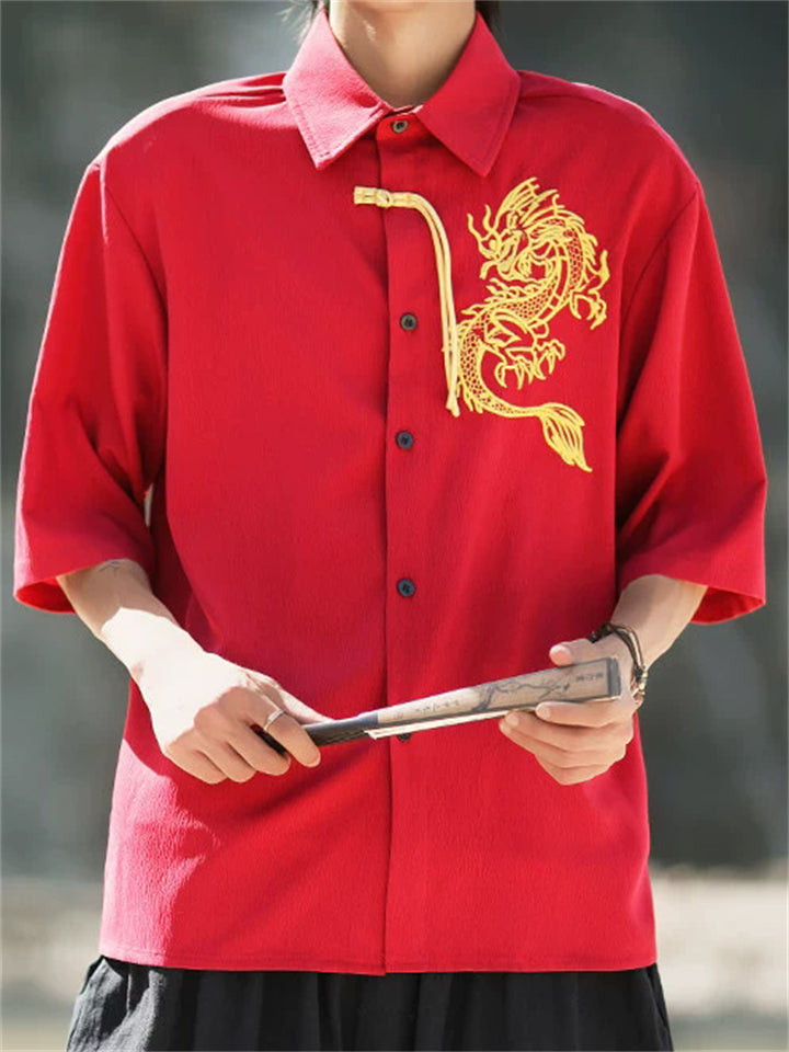Men's Summer Chinese Style Loose Fit Dragon Embroidered Shirts