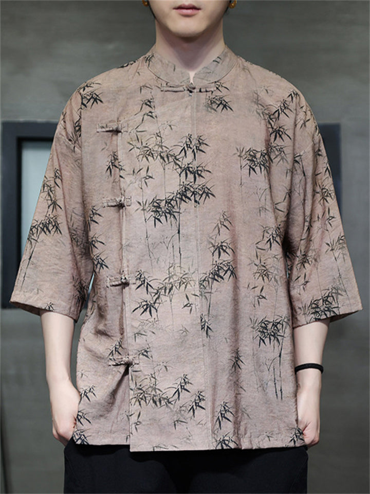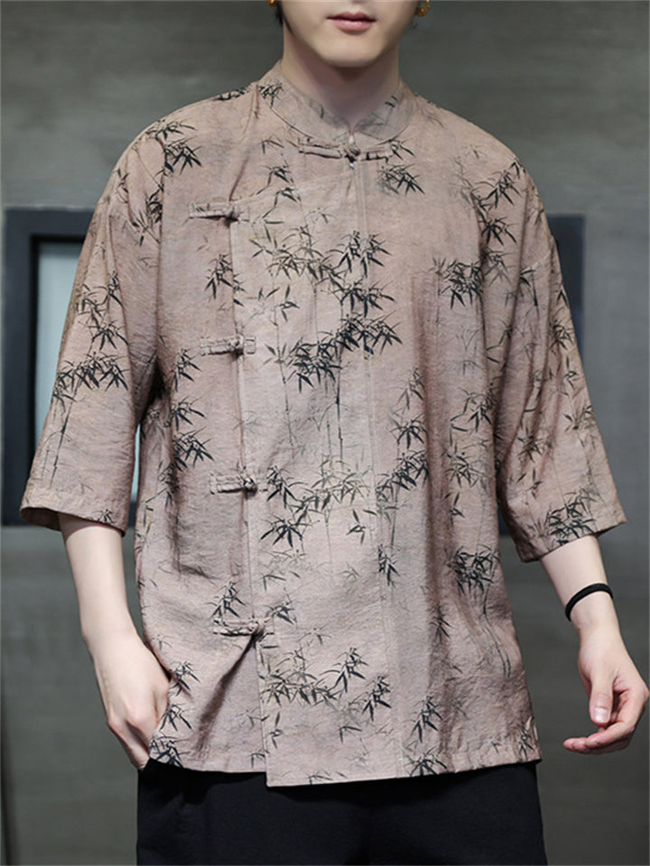 Men's Summer Bamboo Leaves Printed Stand Collar Short Sleeve TangSuit Shirts
