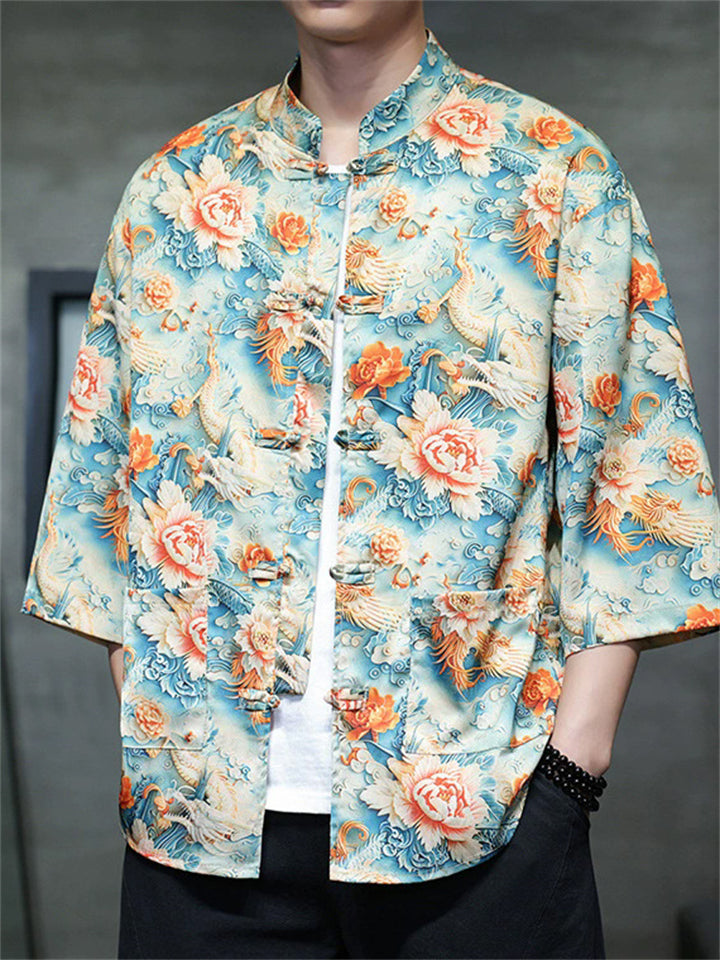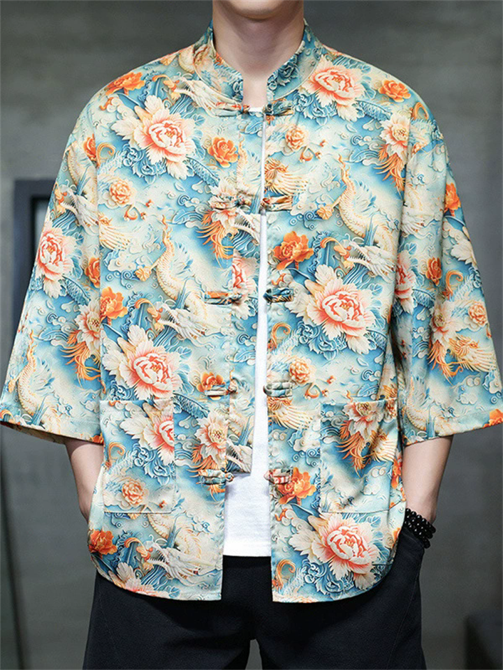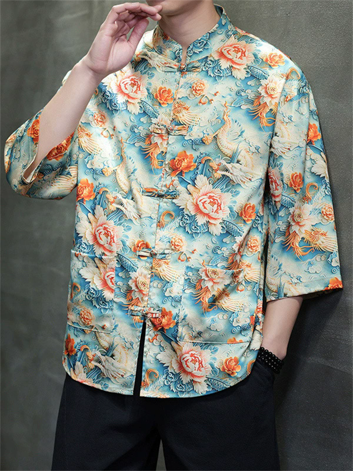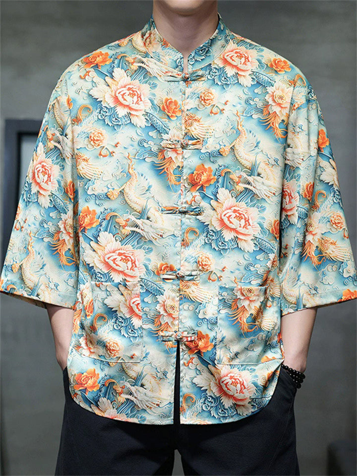 Men's Summer Cool Chinese Style Printed Stand Collar Half Sleeve TangSuit Shirt