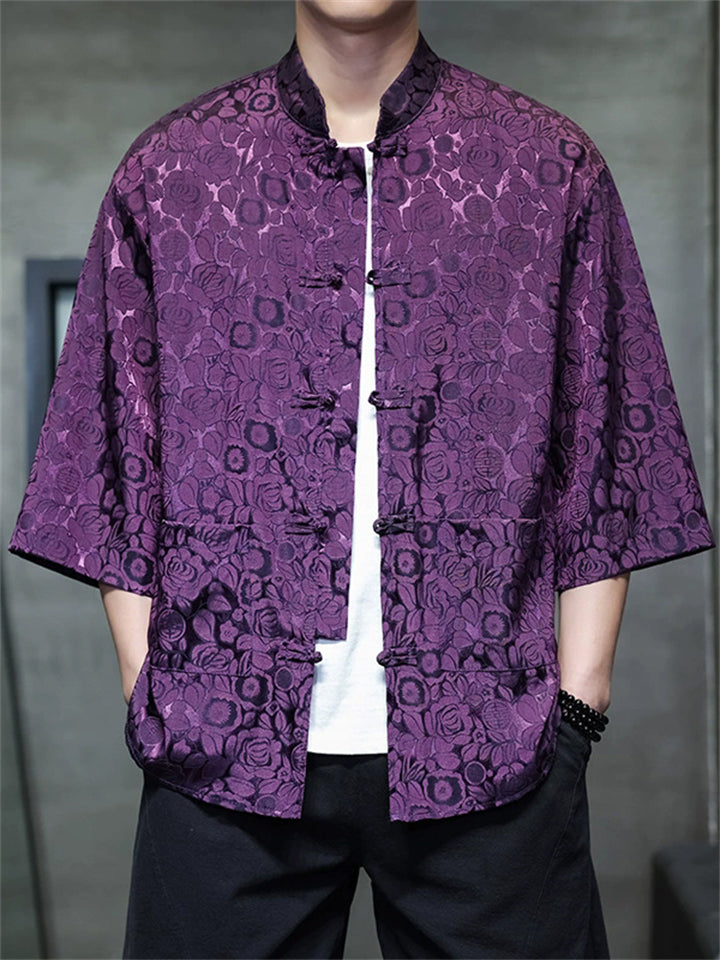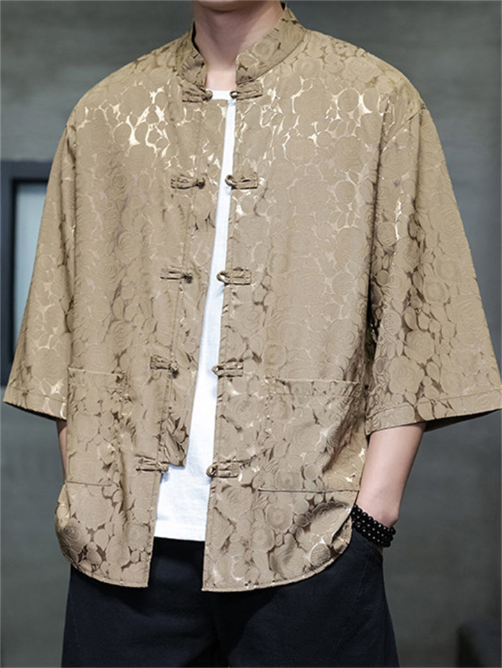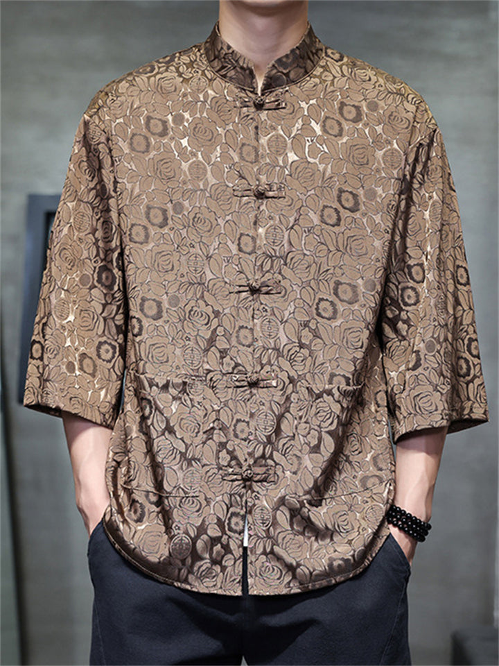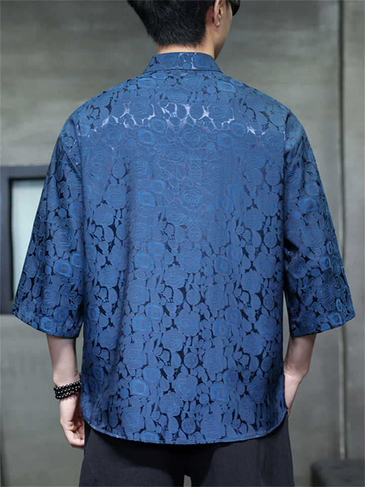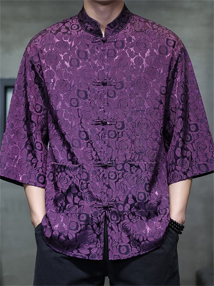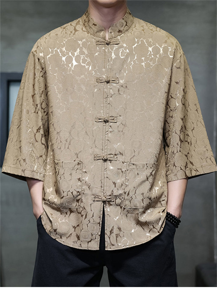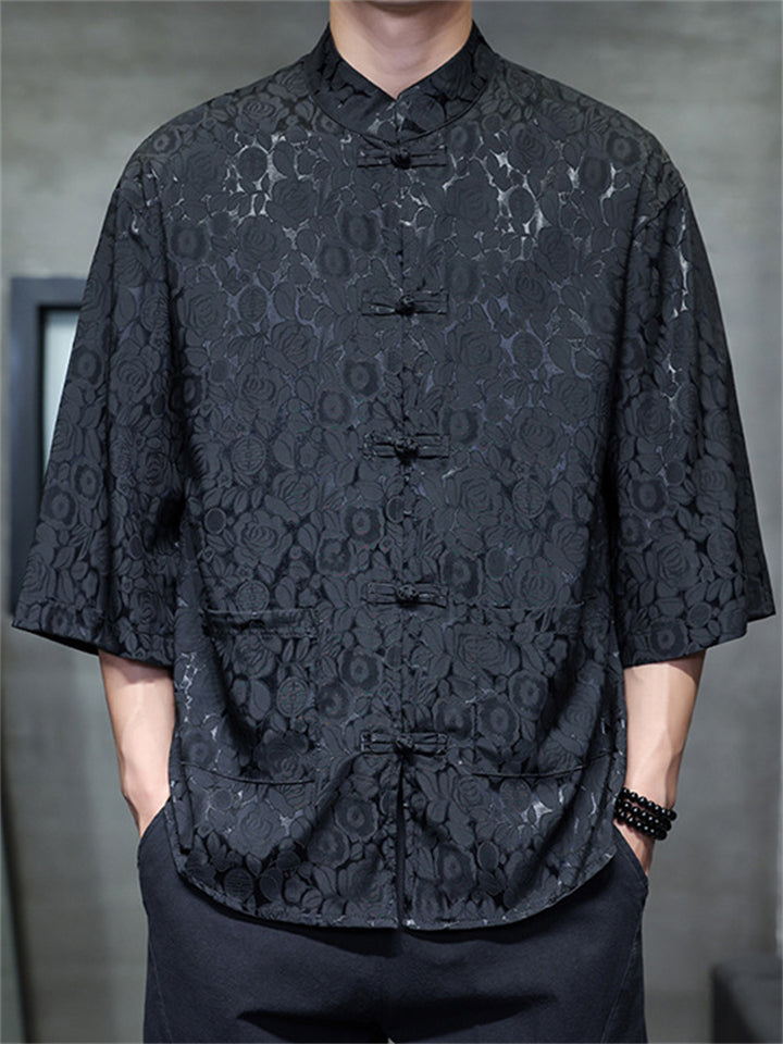 Men's Summer Cool Roses Jacquard Frog Button 3/4 Sleeve Tangsuit Shirts
