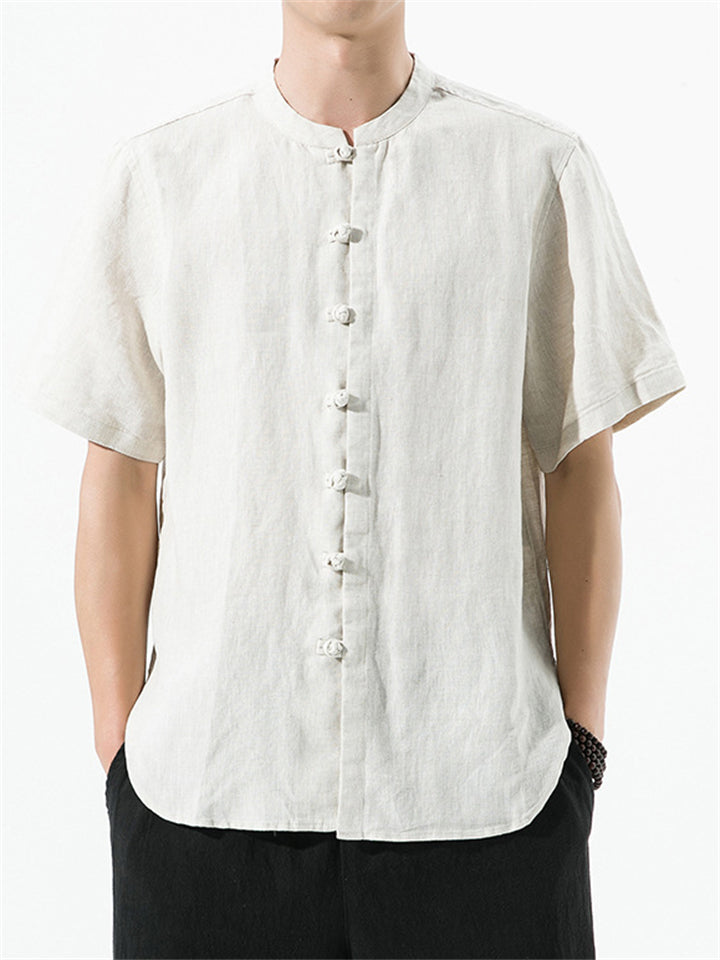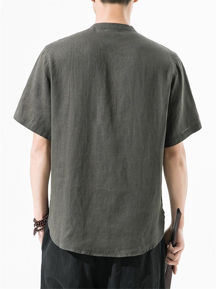 Men's Summer Plain Linen Stand Collar Button Up Shirt