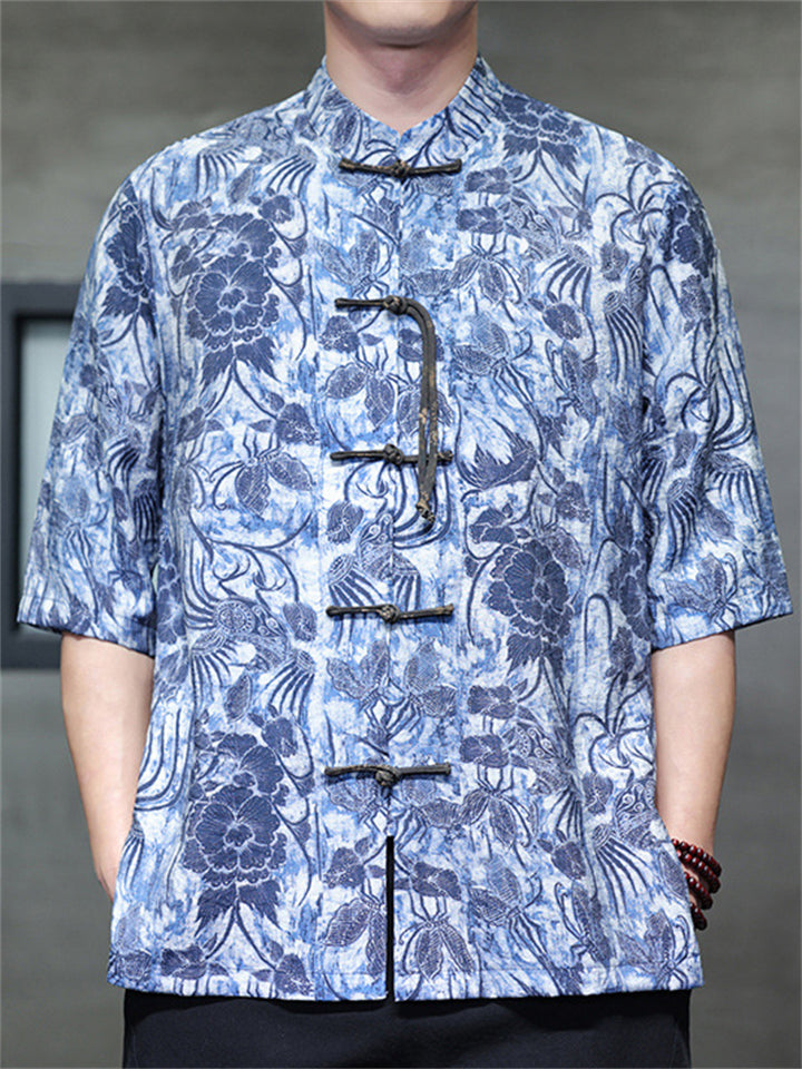 Men's Summer Retro Cotton Linen Print Short Sleeve Tang Suit Shirts