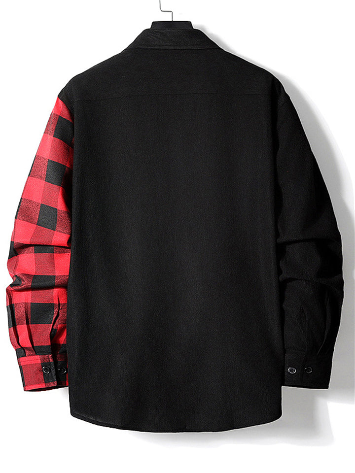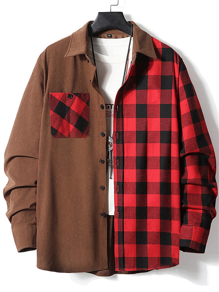 Men's Trendy Corduroy Plaid Patchwork Lapel Long Sleeve Shirt
