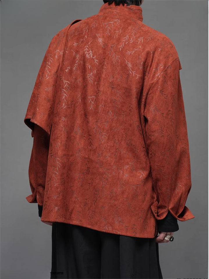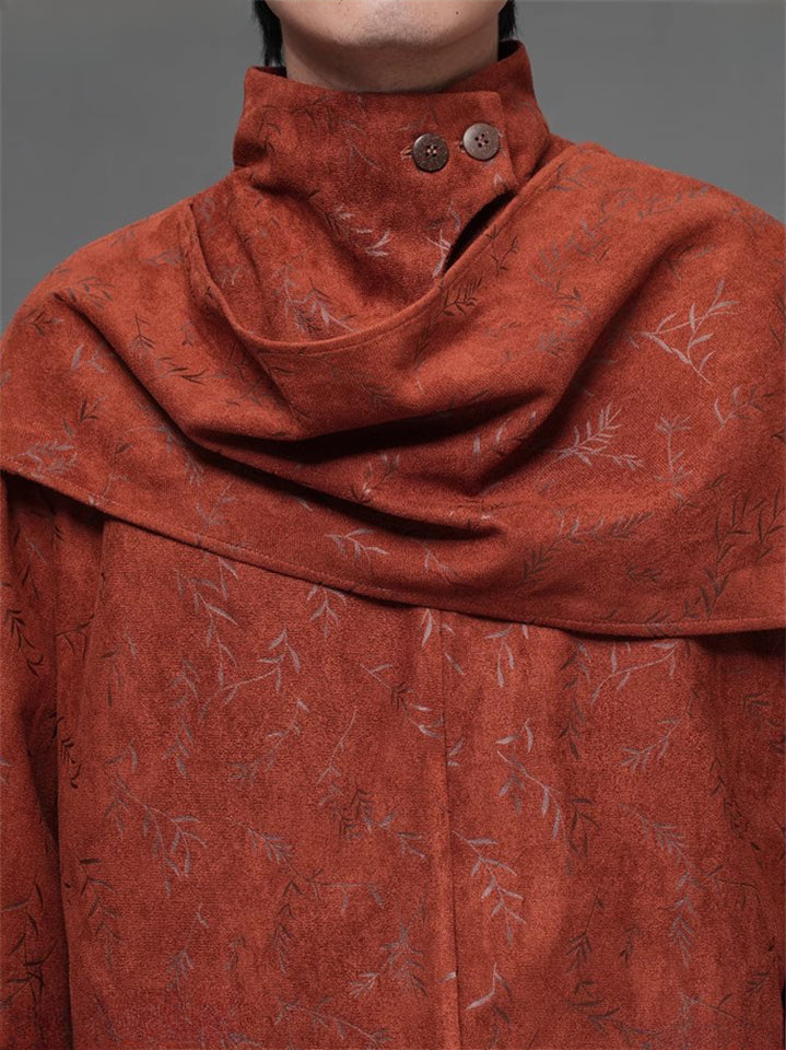 Retro Brown Print Faux Suede Long Sleeve Scarf Shirt for Men
