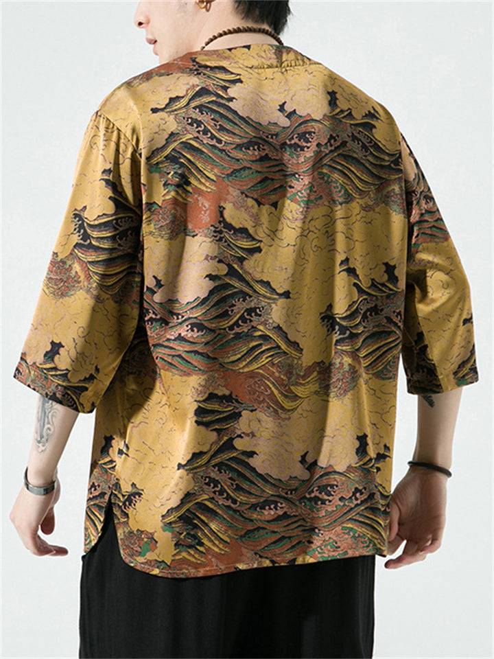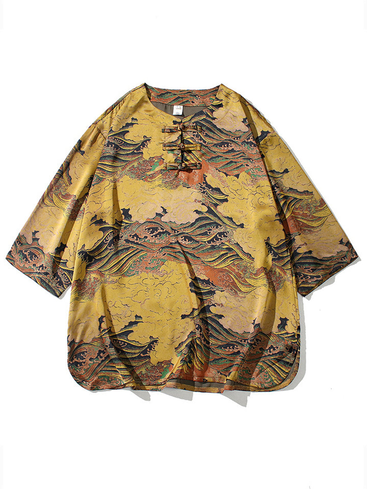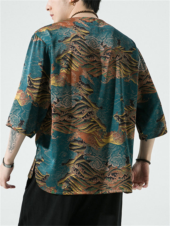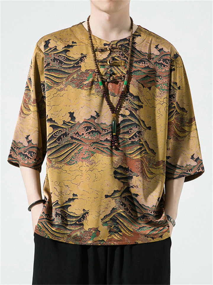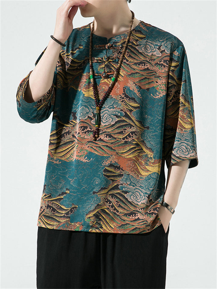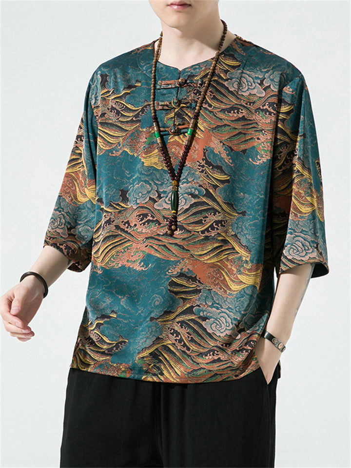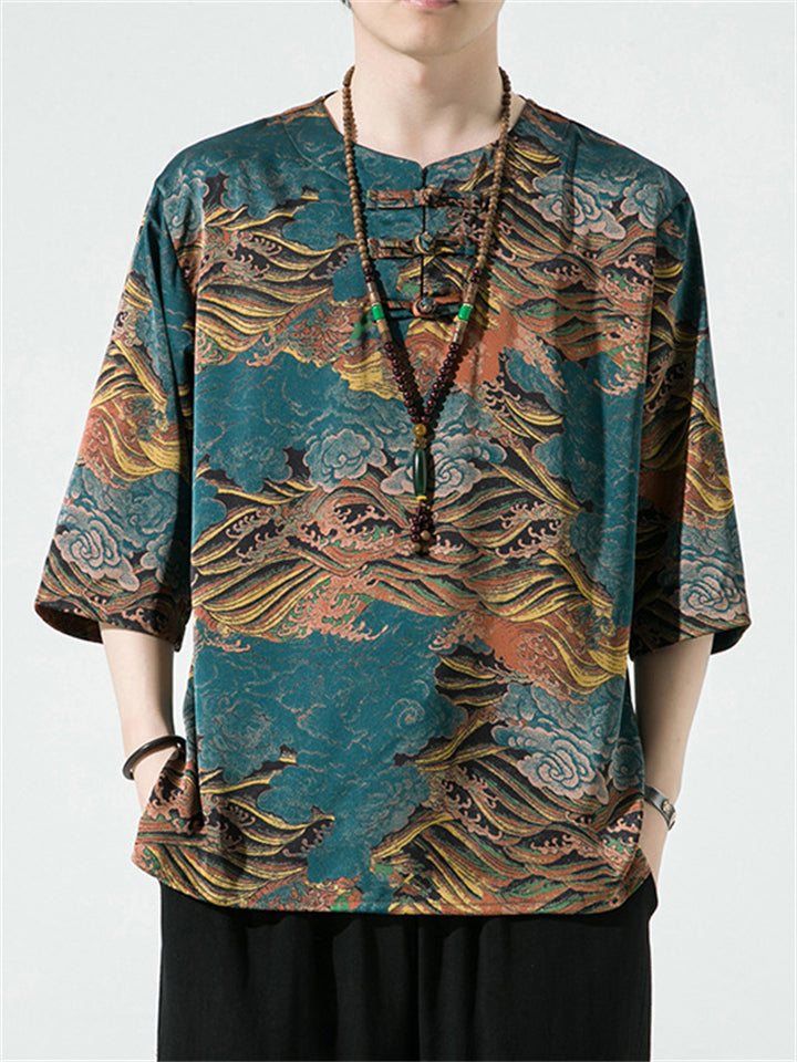 Retro Printed Ice Silk Rounded Collar Shirts for Male