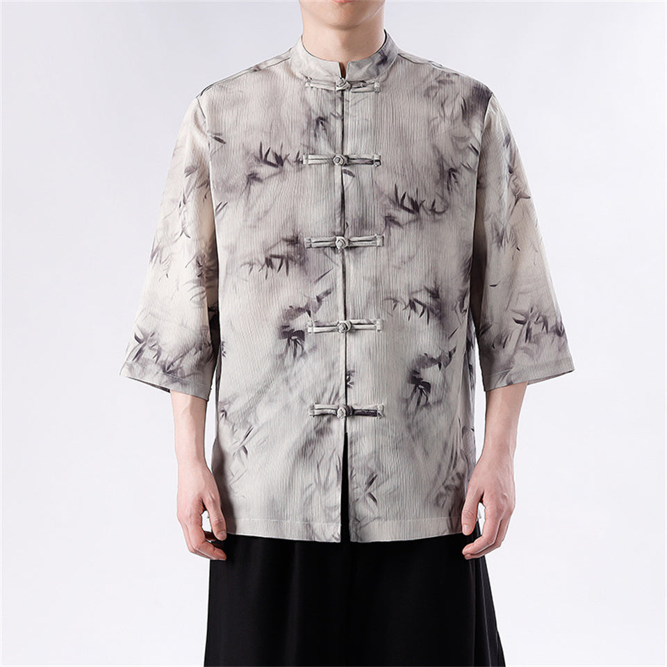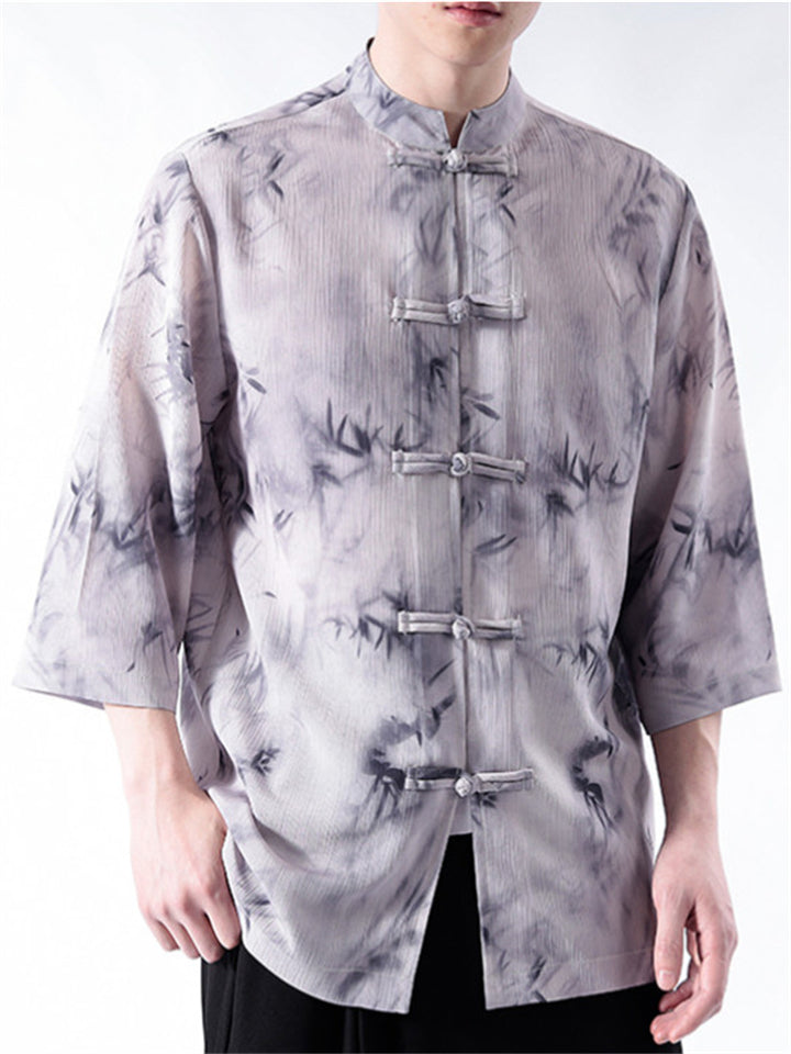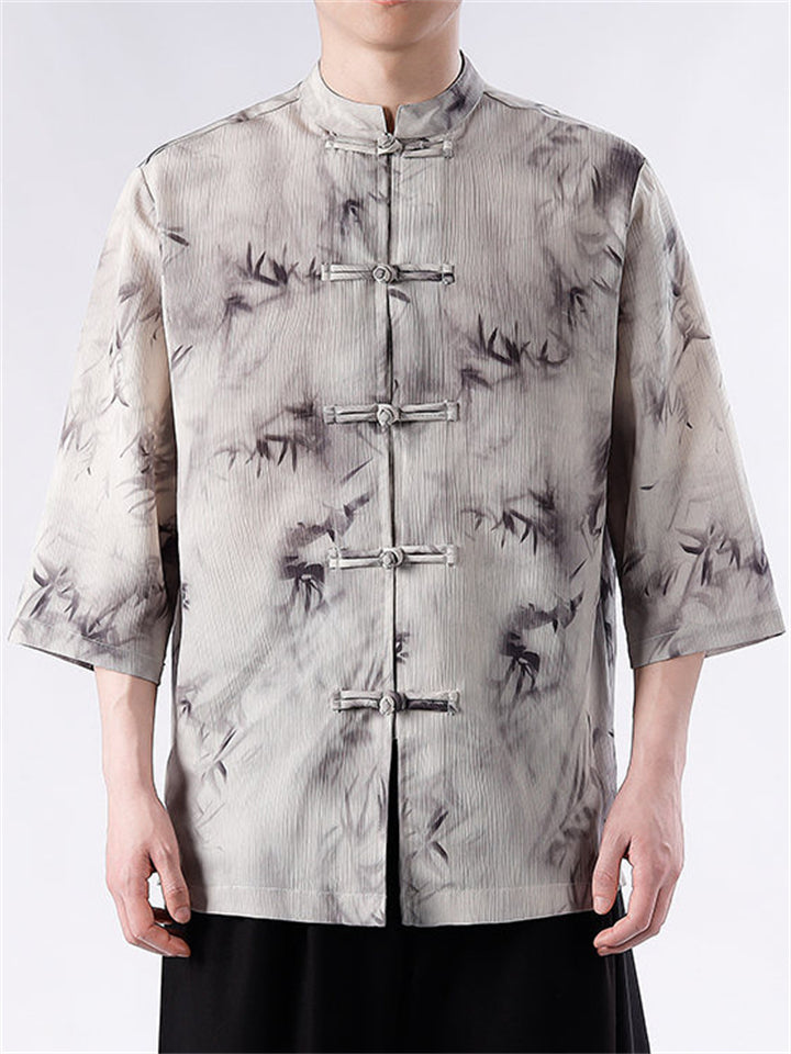 Men's Summer Bamboo Leaves Printed Stand Collar Short Sleeve TangSuit Shirts