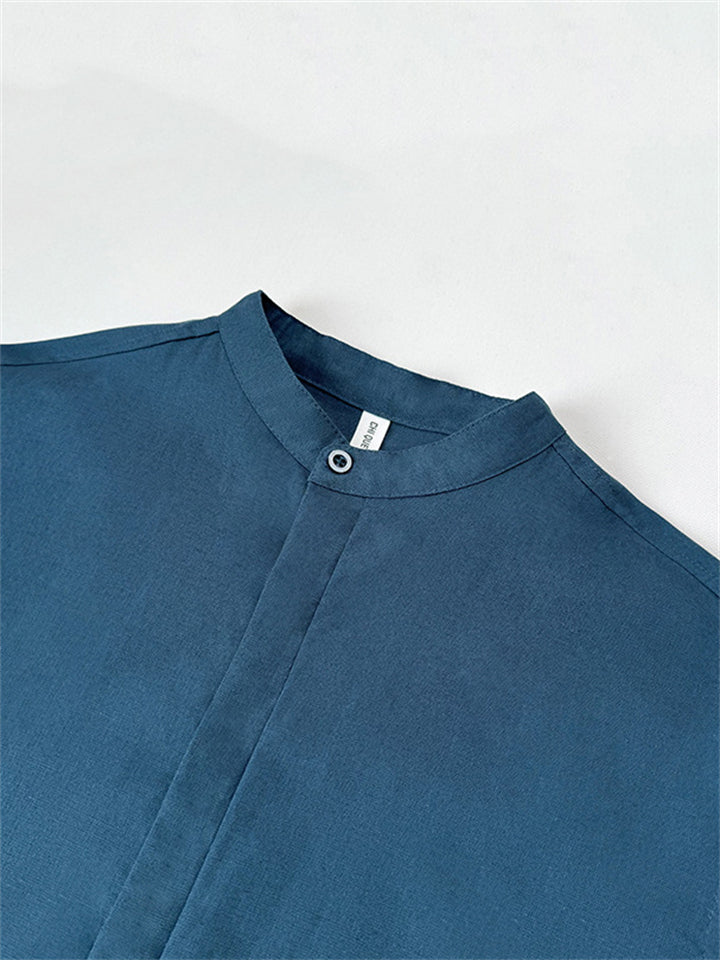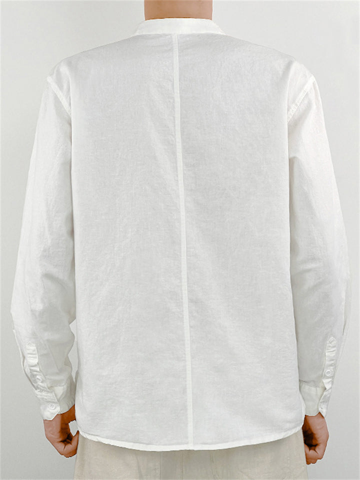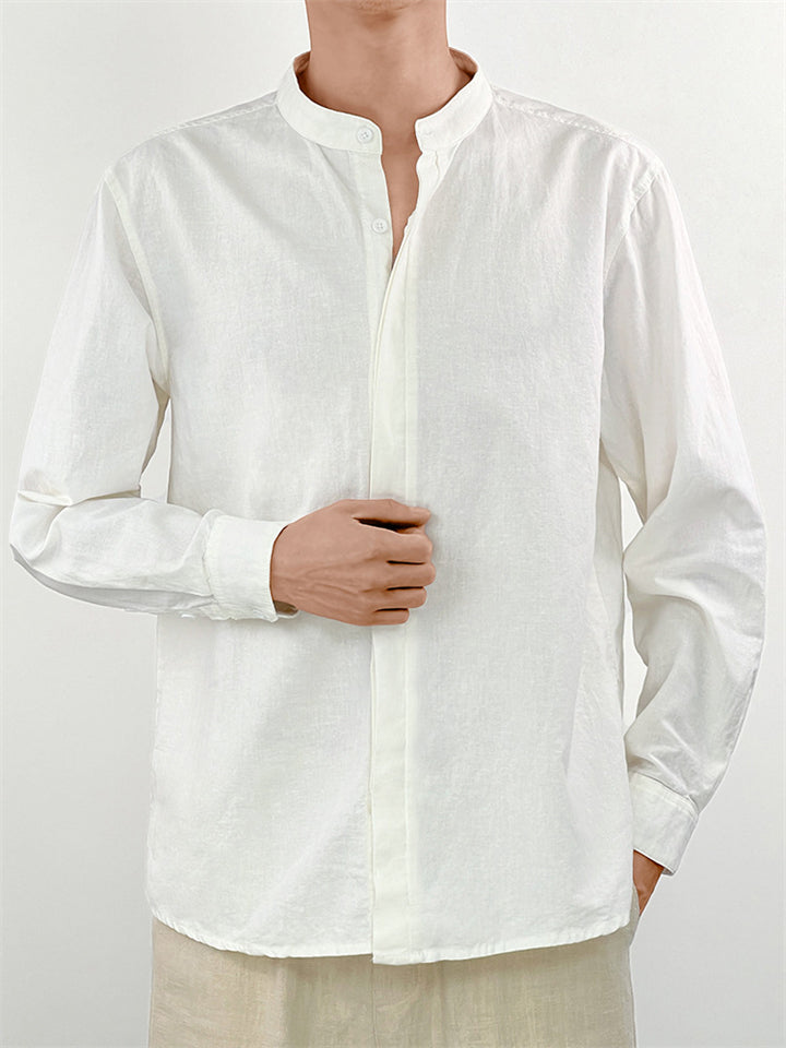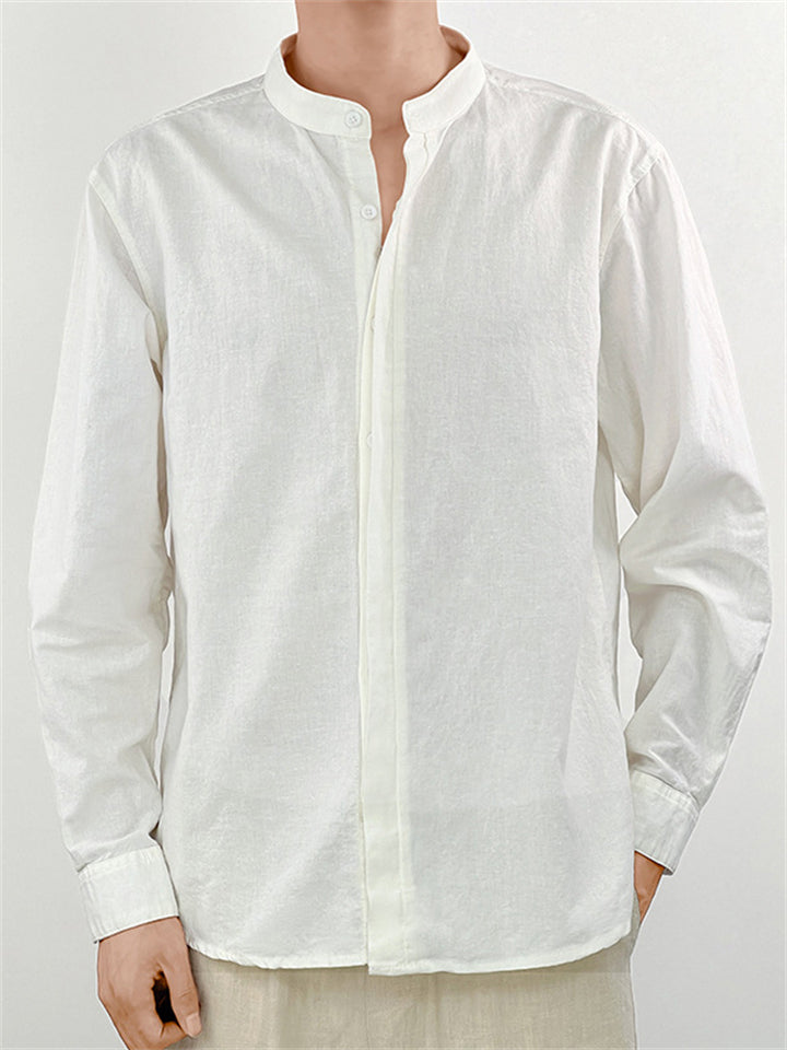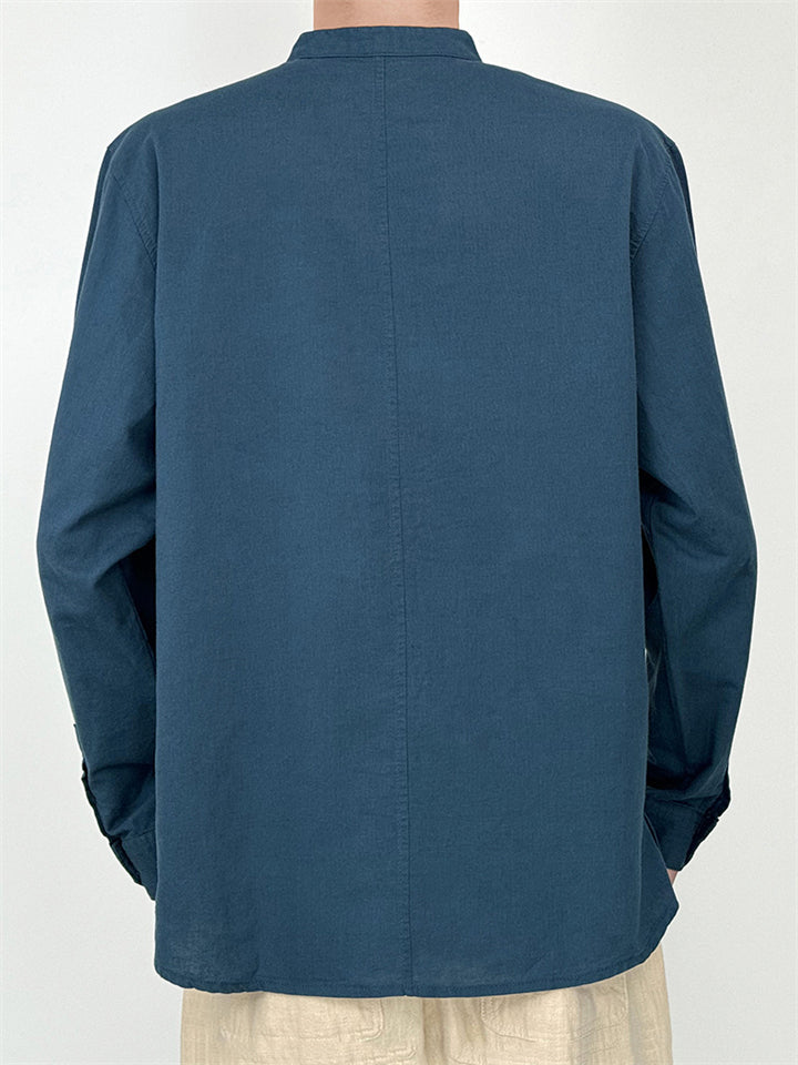 Men's Solid Color Cotton Linen Stand Collar Pullover Long Sleeve Shirts