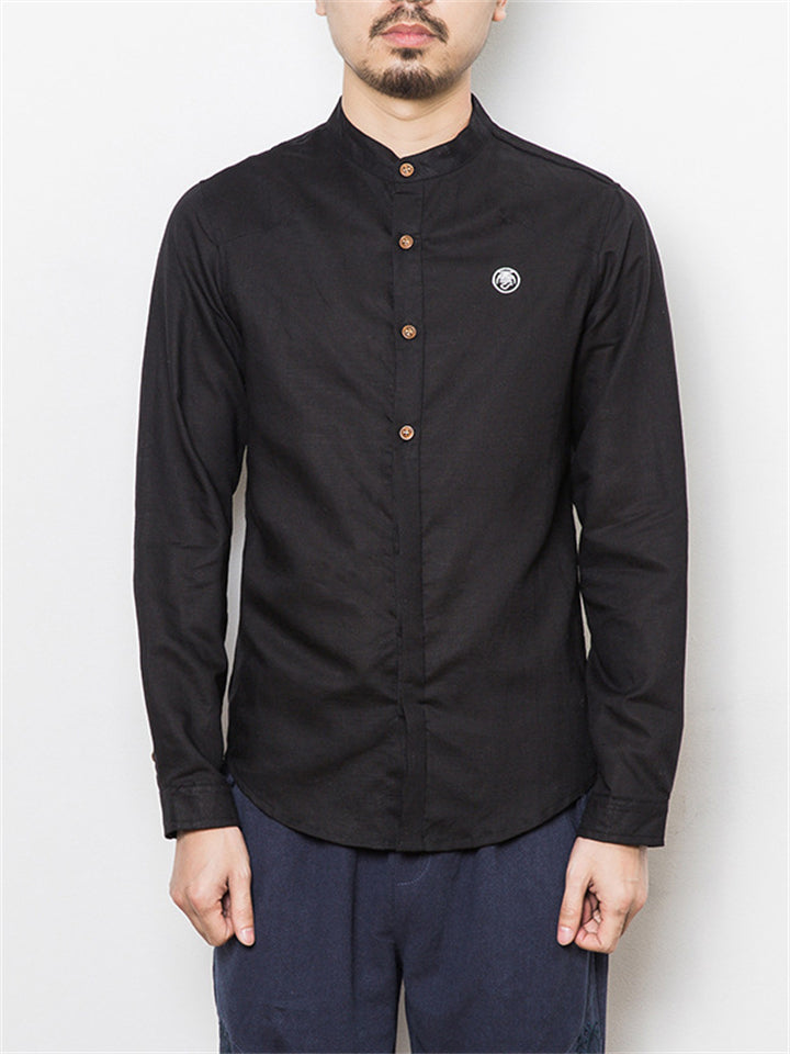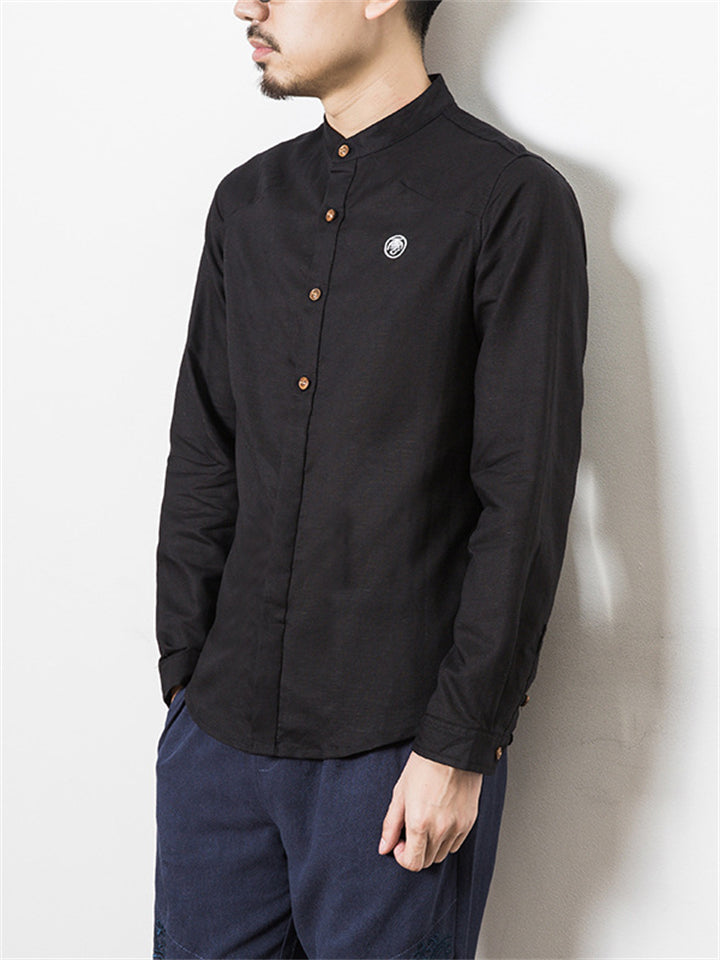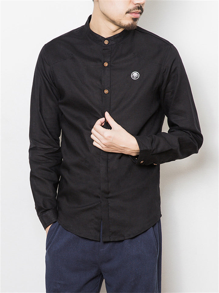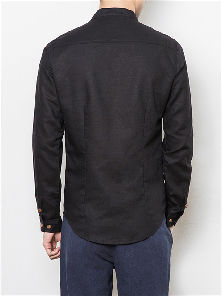 Men's Solid Color Cotton Linen Stand Collar Pullover Long Sleeve Shirts