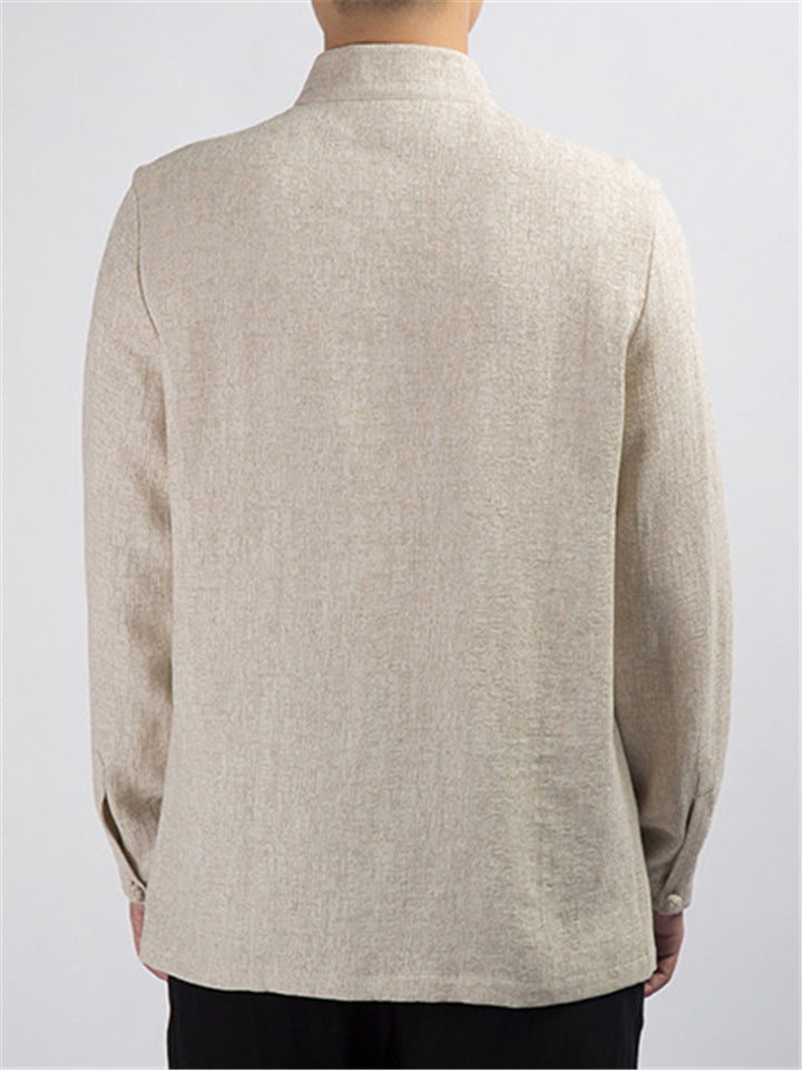 Men's Solid Color Cotton Linen Stand Collar Pullover Long Sleeve Shirts