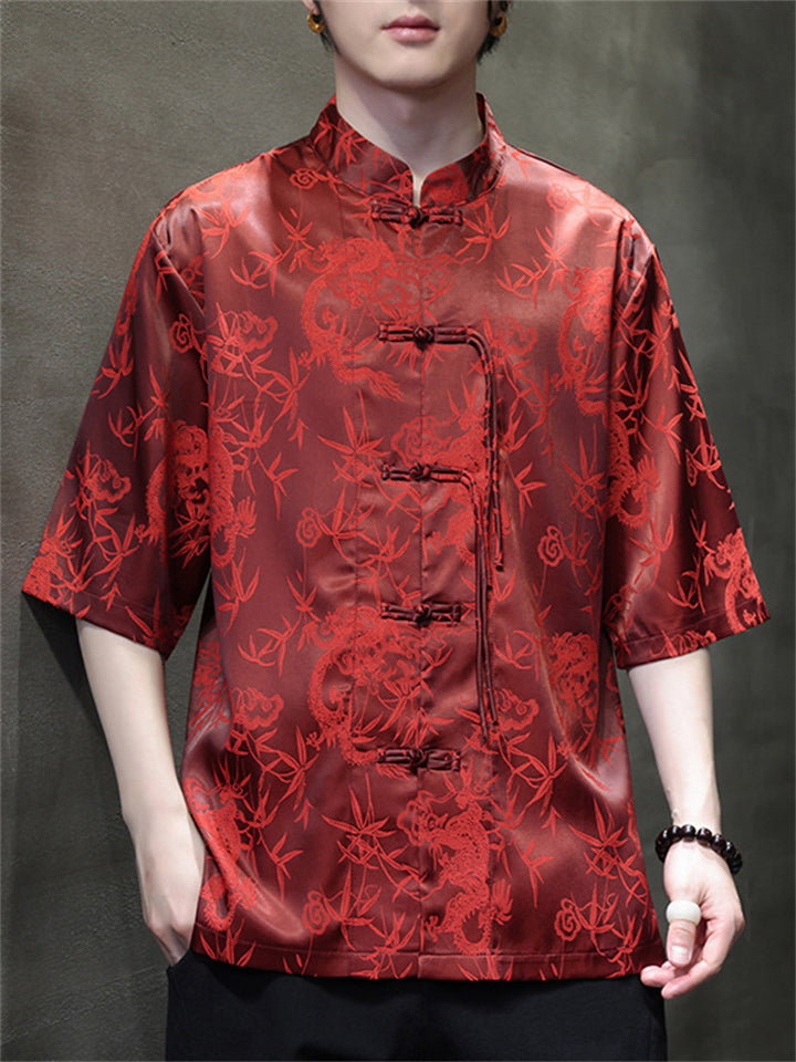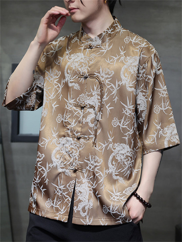 Men's Summer Bamboo Leaves Printed Stand Collar Short Sleeve TangSuit Shirts