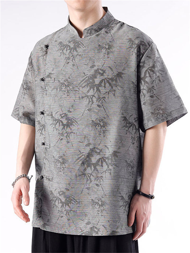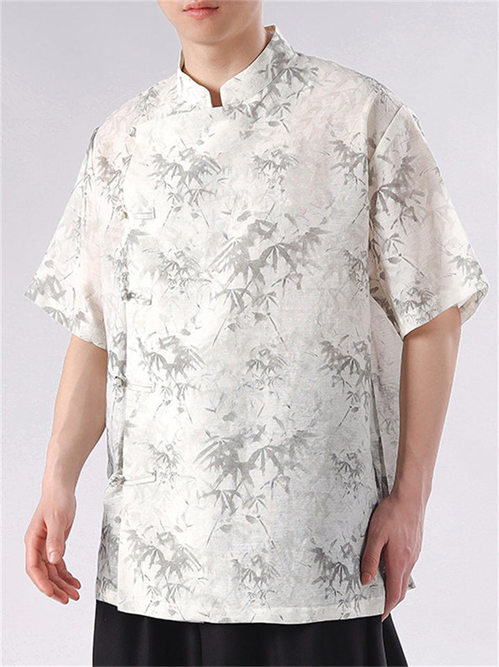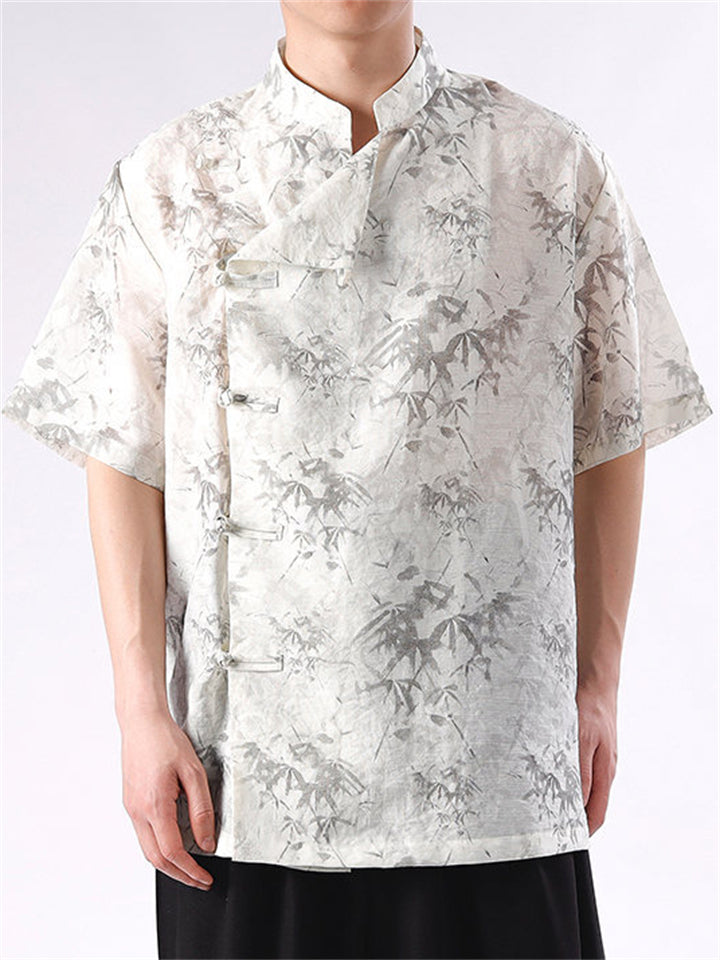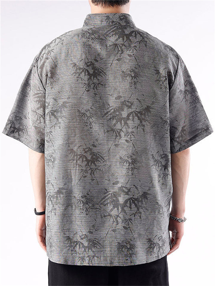 Men's Summer Bamboo Leaves Printed Stand Collar Short Sleeve TangSuit Shirts