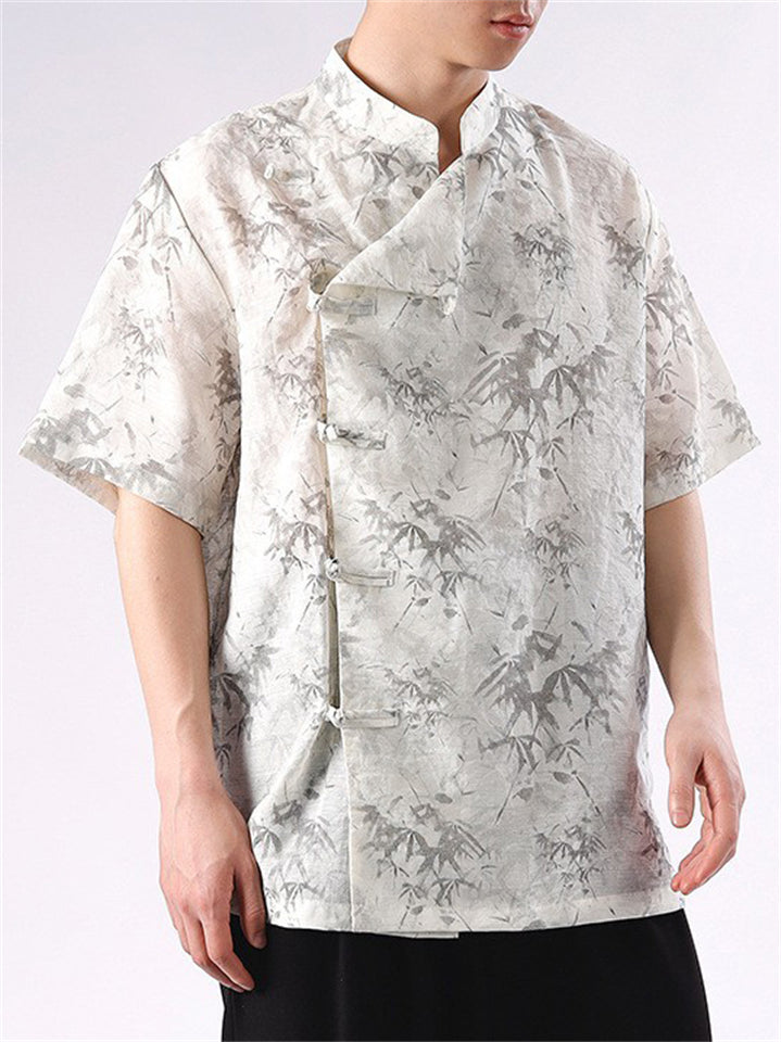 Summer Men's Slant Placket Bamboo Print Short Sleeve Shirts