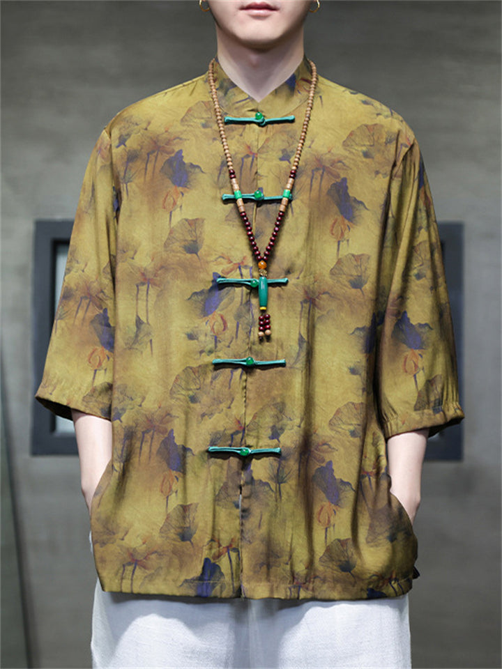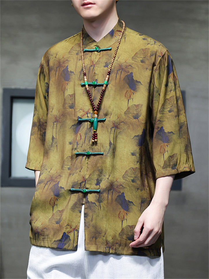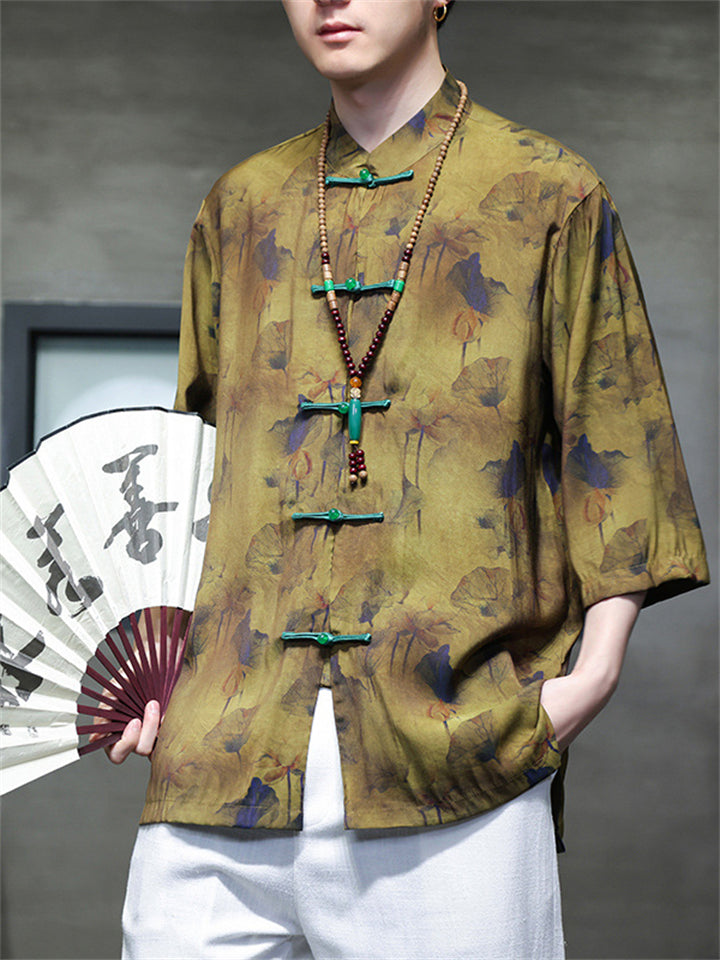 Men's Summer Bamboo Leaves Printed Stand Collar Short Sleeve TangSuit Shirts