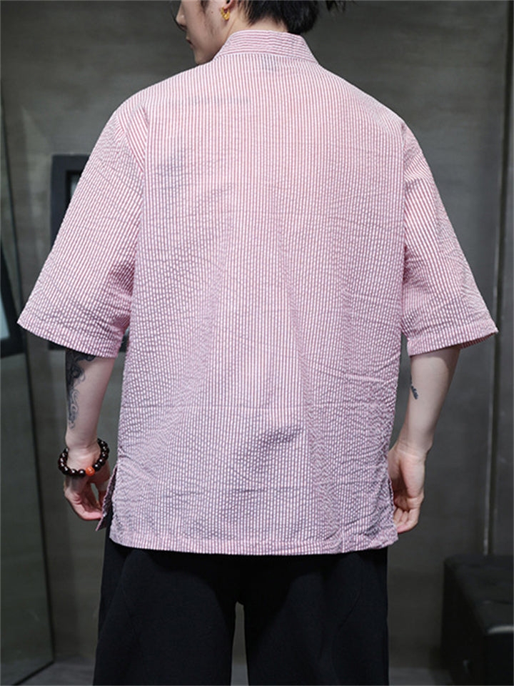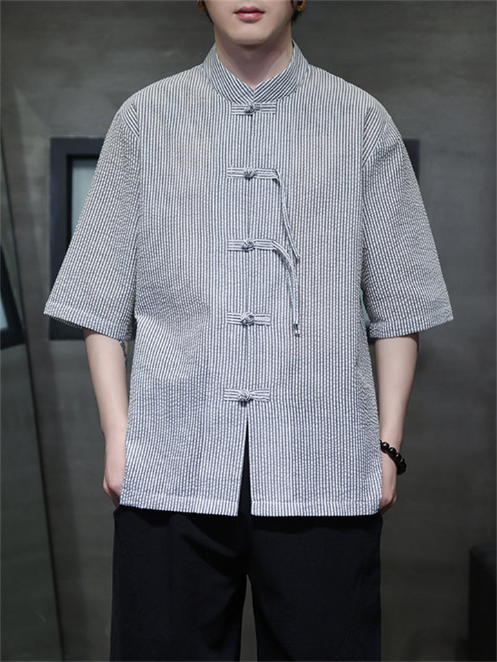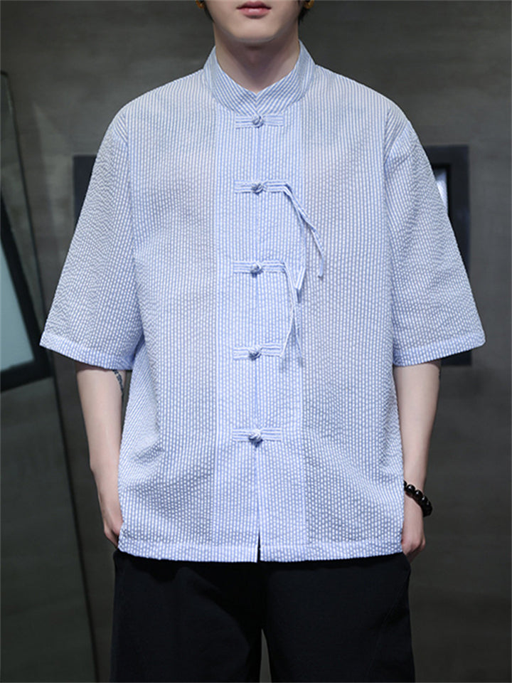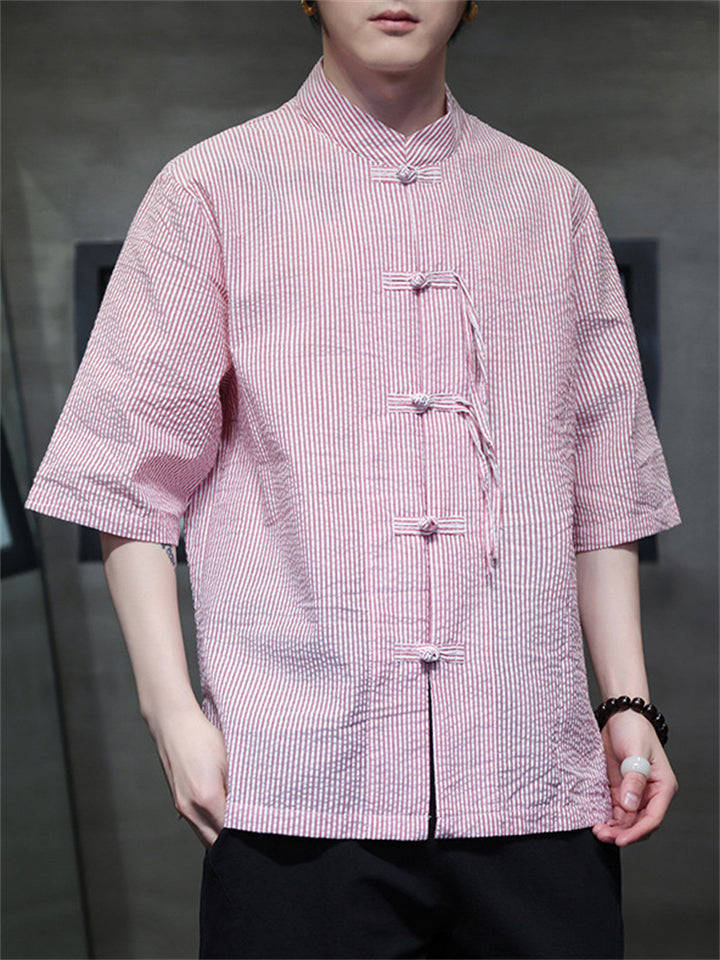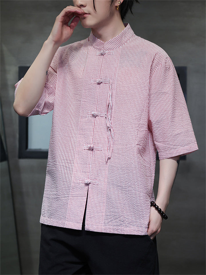 Traditional Chinese Clothing Male Knot Button Stripe Shirts