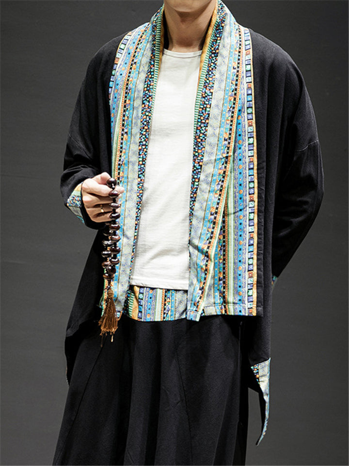 Men's Chinese Style Black Jacquard Corduroy Hooded Cloak Robe Jackets
